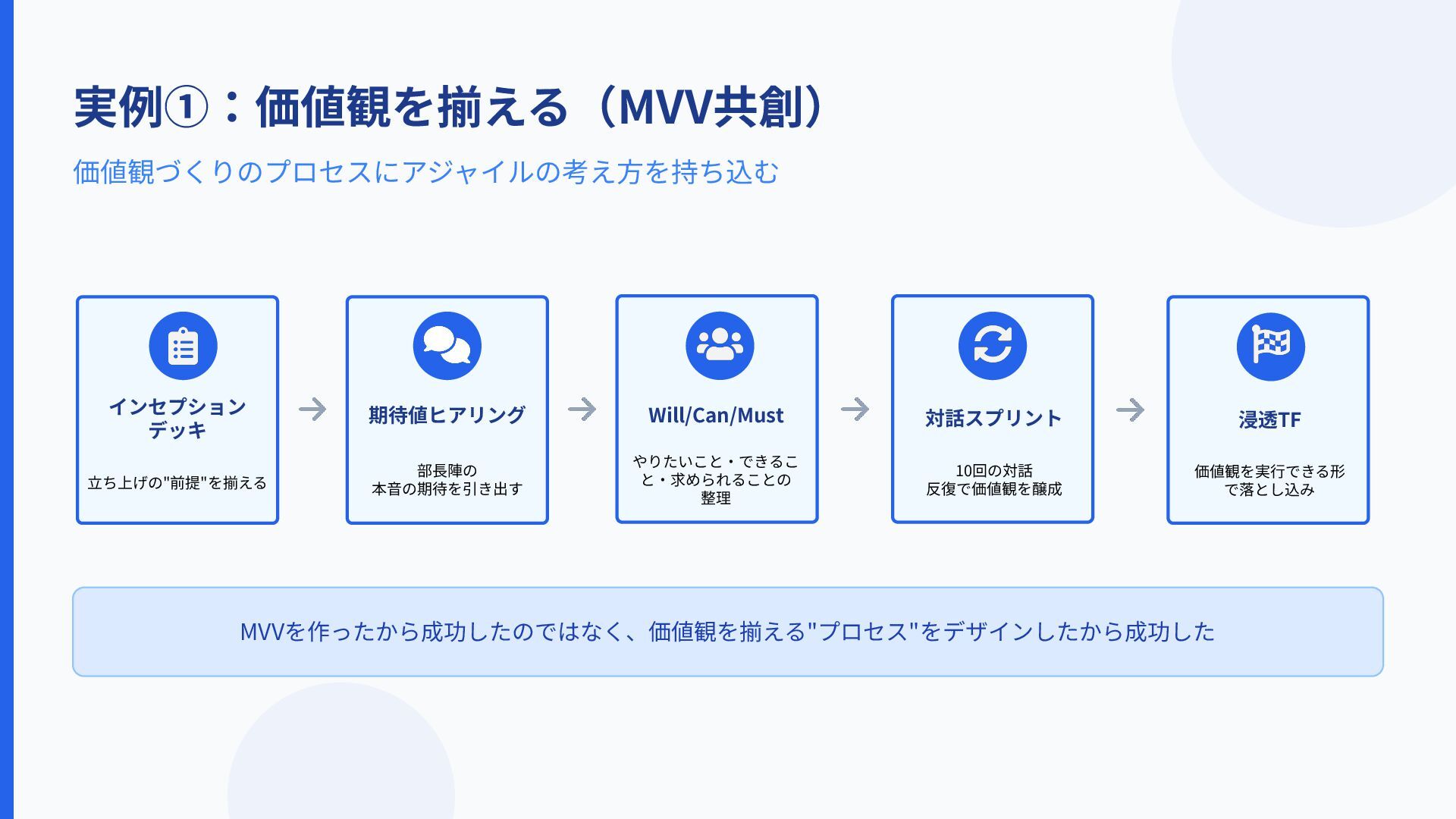 Will/Can/Must やりたいこと‧できるこ と‧求められることの 整理 実例①:価値観を揃える(MVV共創) 浸透TF 価値観を実⾏できる形 で落とし込み MVVを作ったから成功したのではなく、価値観を揃える"プロセス"をデザインしたから成功した