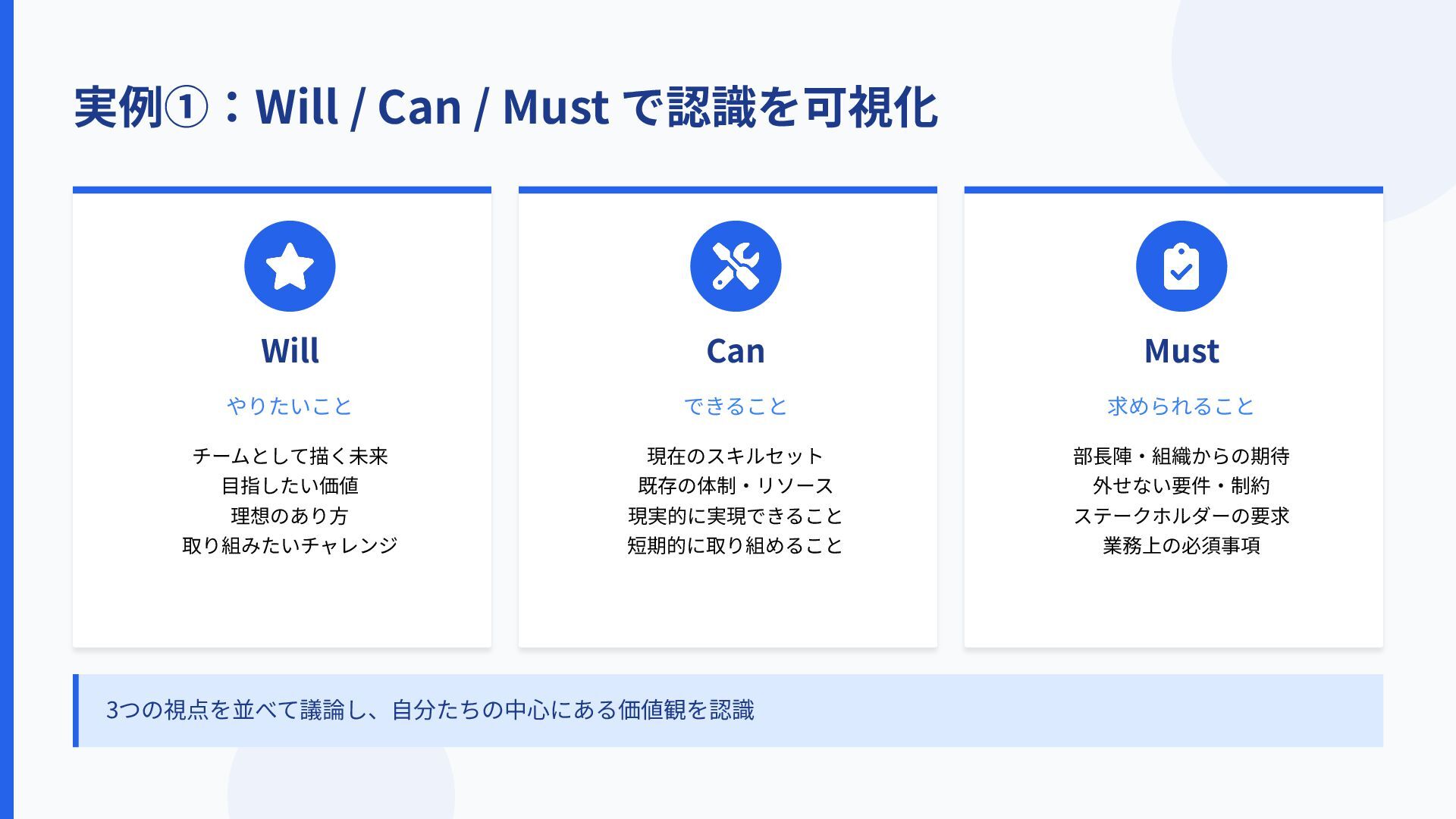 理想のあり⽅ 取り組みたいチャレンジ Can できること 現在のスキルセット 既存の体制‧リソース 現実的に実現できること 短期的に取り組めること Must 求められること 部⻑陣‧組織からの期待 外せない要件‧制約 ステークホルダーの要求 業務上の必須事項 3つの視点を並べて議論することで価値観ギャップを発⾒ → 合意形成へ 3つの視点を並べて議論し、⾃分たちの中⼼にある価値観を認識