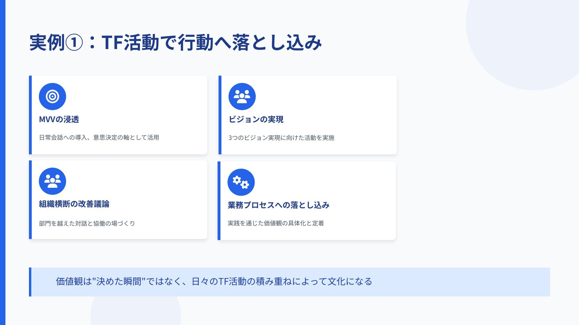 MVVの浸透 ⽇常会話への導⼊、意思決定の軸として活⽤ 組織横断の改善議論 部⾨を越えた対話と協働の場づくり 業務プロセスへの落とし込み 実践を通じた価値観の具体化と定着 ビジョンの実現 3つのビジョン実現に向けた活動を実施 実例①:TF活動で⾏動へ落とし込み 価値観は"決めた瞬間"ではなく、⽇々のTF活動の積み重ねによって⽂化になる