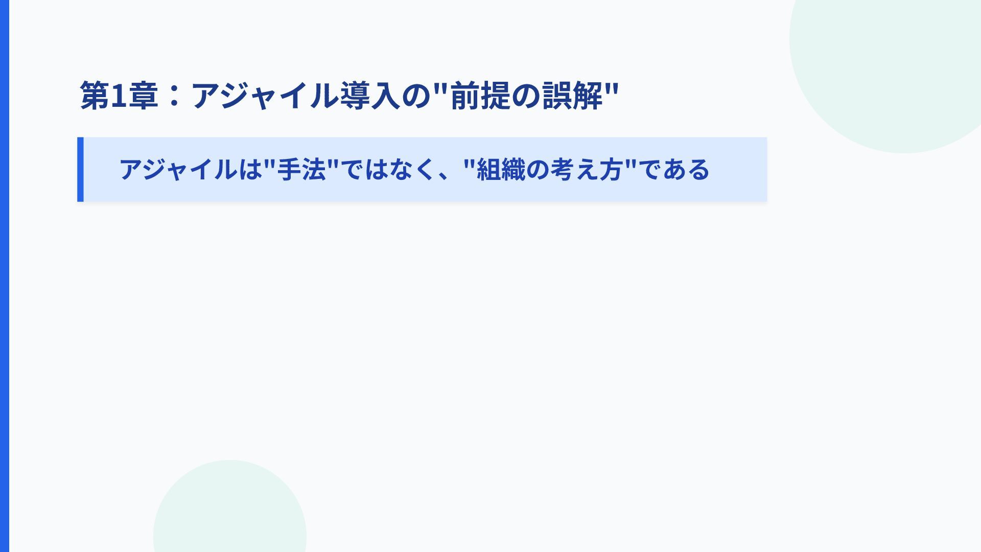 第1章:アジャイル導⼊の"前提の誤解" アジャイルは"⼿法"ではなく、"組織の考え⽅"である