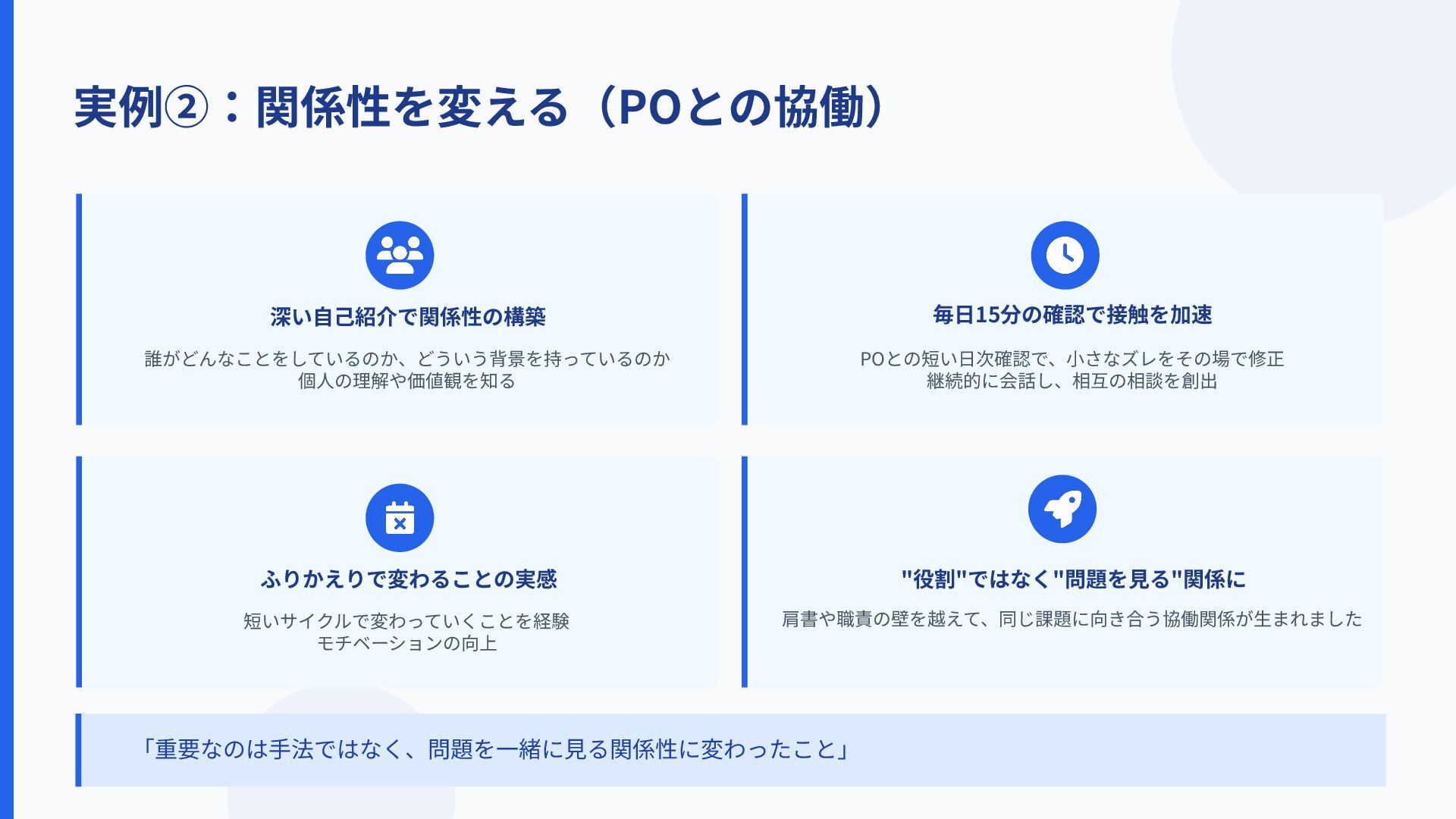 実例②:関係性を変える(POとの協働) ふりかえりで変わることの実感 短いサイクルで変わっていくことを経験 モチベーションの向上 毎⽇15分の確認で接触を加速 POとの短い⽇次確認で、⼩さなズレをその場で修正 継続的に会話し、相互の相談を創出 深い⾃⼰紹介で関係性の構築 誰がどんなことをしているのか、どういう背景を持っているのか 個⼈の理解や価値観を知る