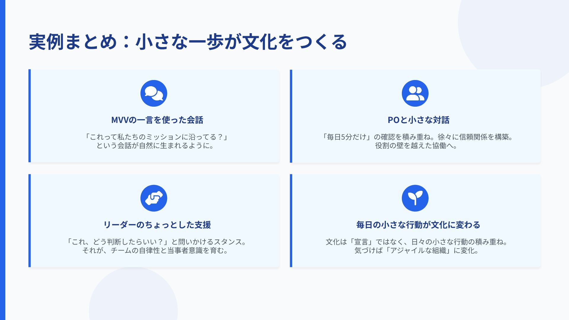 実例まとめ:⼩さな⼀歩が⽂化をつくる MVVの⼀⾔を使った会話 「これって私たちのミッションに沿ってる?」 という会話が⾃然に⽣まれるように。 POと⼩さな対話 毎⽇の⼩さな⾏動が⽂化に変わる 「毎⽇5分だけ」の確認を積み重ね。徐々に信頼関係を構築。 役割の壁を越えた協働へ。 リーダーのちょっとした⽀援 「これ、どう判断したらいい?」と問いかけるスタンス。
