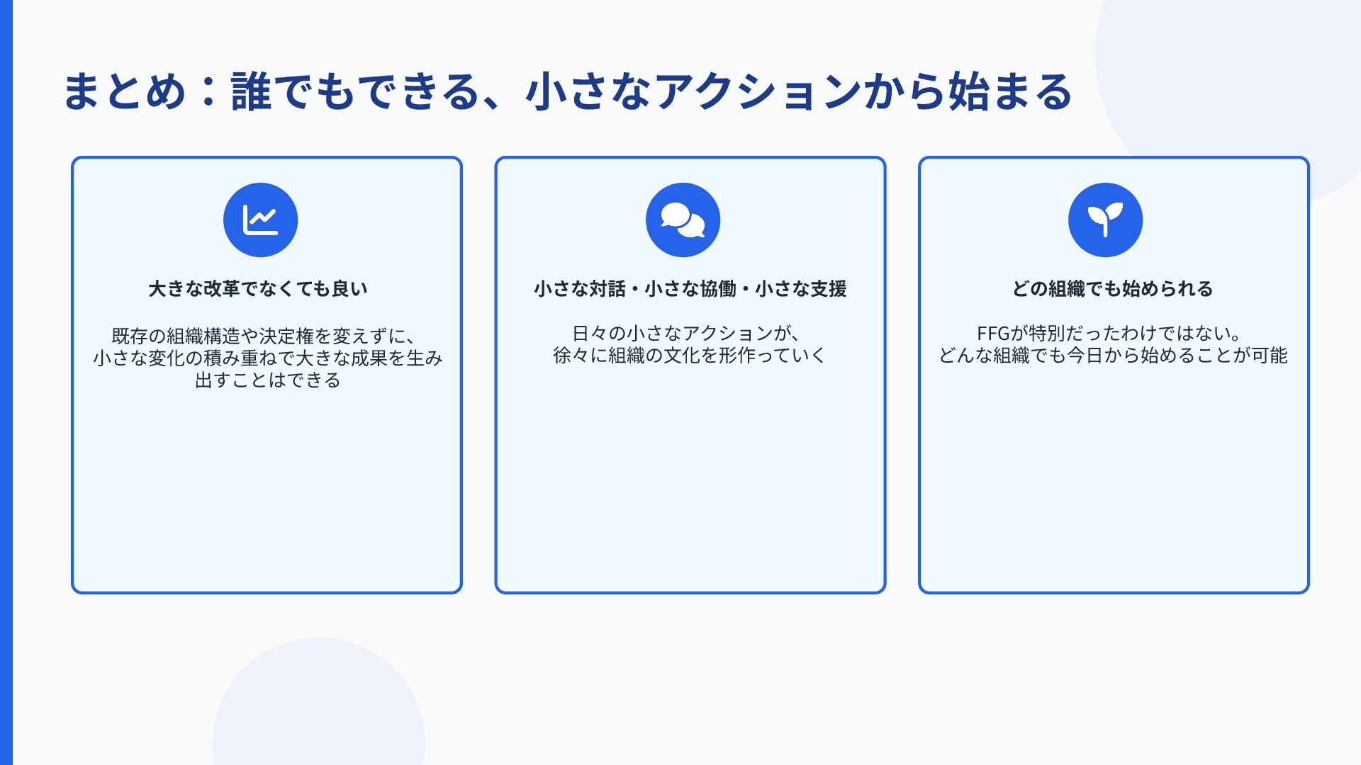 まとめ:誰でもできる、⼩さなアクションから始まる ⼤きな改⾰でなくても良い 既存の組織構造や決定権を変えずに、 ⼩さな変化の積み重ねで⼤きな成果を⽣み 出すことはできる ⼩さな対話‧⼩さな協働‧⼩さな⽀援 ⽇々の⼩さなアクションが、 徐々に組織の⽂化を形作っていく どの組織でも始められる FFGが特別だったわけではない。