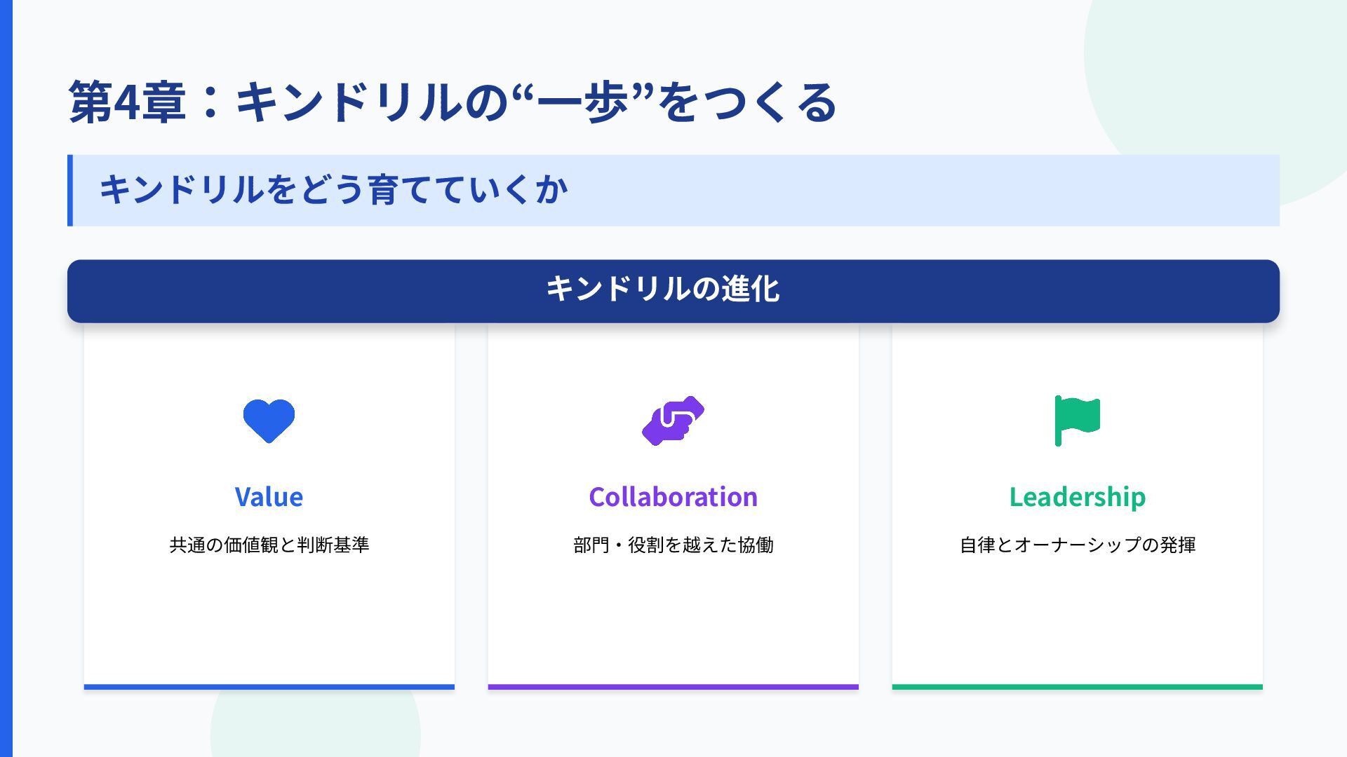 第4章:キンドリルの“⼀歩”をつくる 劇的な転換ではなく、⼩さな積み上げが組織を変えた Value 共通の価値観と判断基準 Collaboration 部⾨‧役割を越えた協働 Leadership ⾃律とオーナーシップの発揮 キンドリルの進化 キンドリルをどう育てていくか