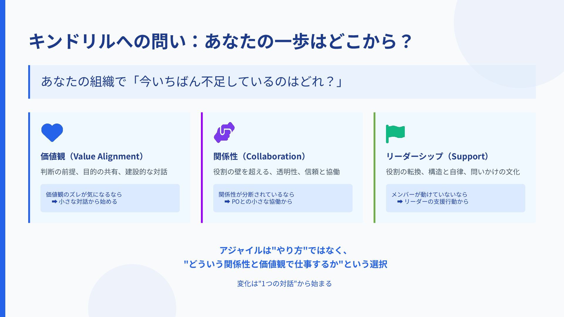 キンドリルへの問い:あなたの⼀歩はどこから? あなたの組織で「今いちばん不⾜しているのはどれ?」 価値観(Value Alignment) 関係性(Collaboration) 判断の前提、⽬的の共有、建設的な対話 価値観のズレが気になるなら ➡ ⼩さな対話から始める リーダーシップ(Support)