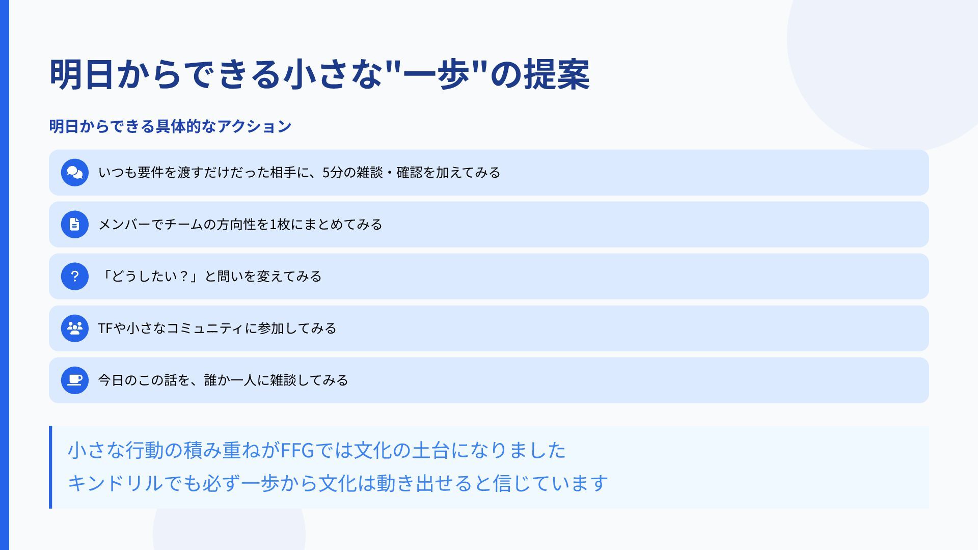 明⽇からできる⼩さな"⼀歩"の提案 明⽇からできる具体的なアクション いつも要件を渡すだけだった相⼿に、5分の雑談‧確認を加えてみる メンバーでチームの⽅向性を1枚にまとめてみる 「どうしたい?」と問いを変えてみる TFや⼩さなコミュニティに参加してみる 今⽇のこの話を、誰か⼀⼈に雑談してみる ⼩さな⾏動の積み重ねがFFGでは⽂化の⼟台になりました キンドリルでも必ず⼀歩から⽂化は動き出せると信じています