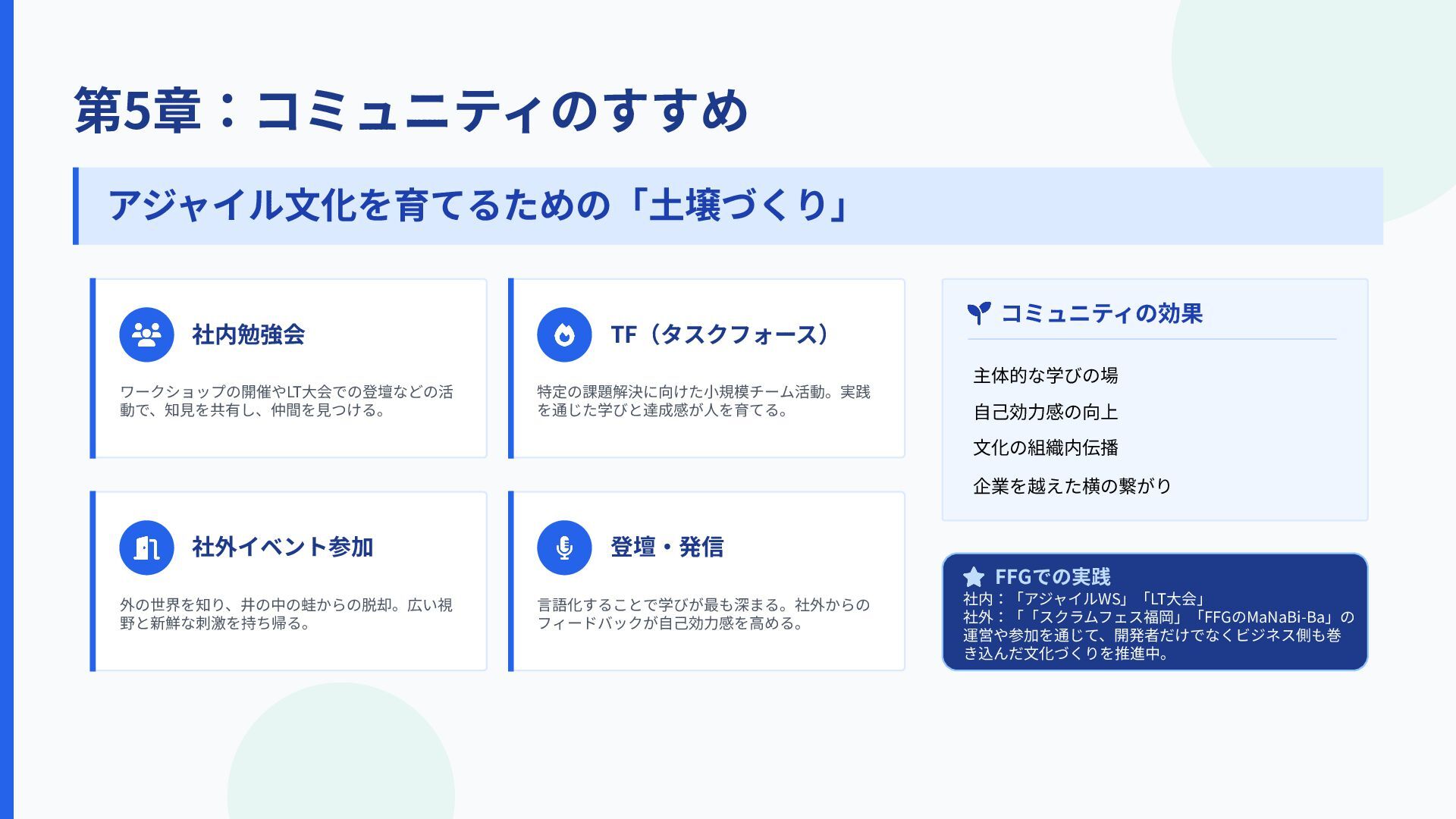 フィードバックが⾃⼰効⼒感を⾼める。 社内勉強会 TF(タスクフォース) 社外イベント参加 登壇‧発信 コミュニティの効果 主体的な学びの場 ⾃⼰効⼒感の向上 ⽂化の組織内伝播 企業を越えた横の繋がり FFGでの実践 社内:「アジャイルWS」「LT⼤会」 社外:「「スクラムフェス福岡」「FFGのMaNaBi-Ba」の 運営や参加を通じて、開発者だけでなくビジネス側も巻 き込んだ⽂化づくりを推進中。