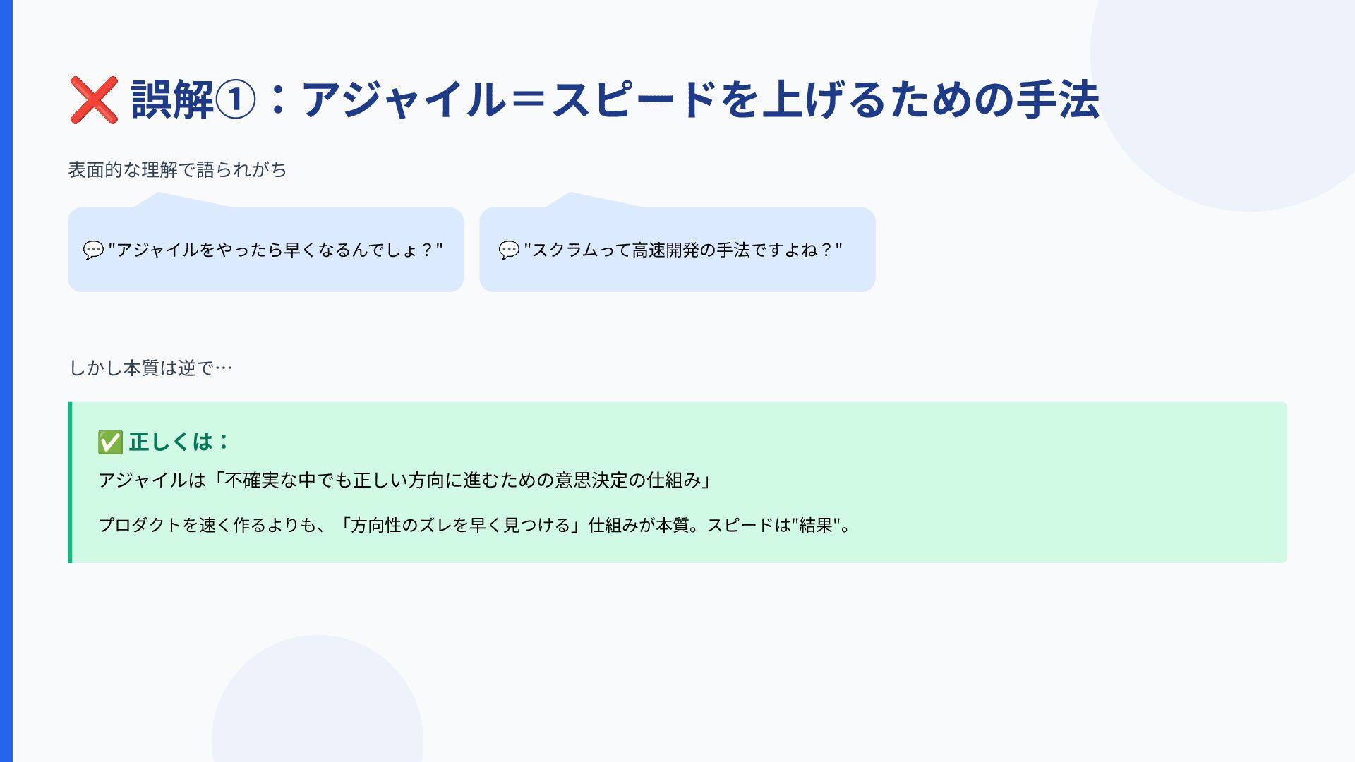 ❌ 誤解①:アジャイル=スピードを上げるための⼿法 しかし本質は逆で… ✅ 正しくは: アジャイルは「不確実な中でも正しい⽅向に進むための意思決定の仕組み」 プロダクトを速く作るよりも、「⽅向性のズレを早く⾒つける」仕組みが本質。スピードは"結果"。 💬 "アジャイルをやったら早くなるんでしょ?" 💬