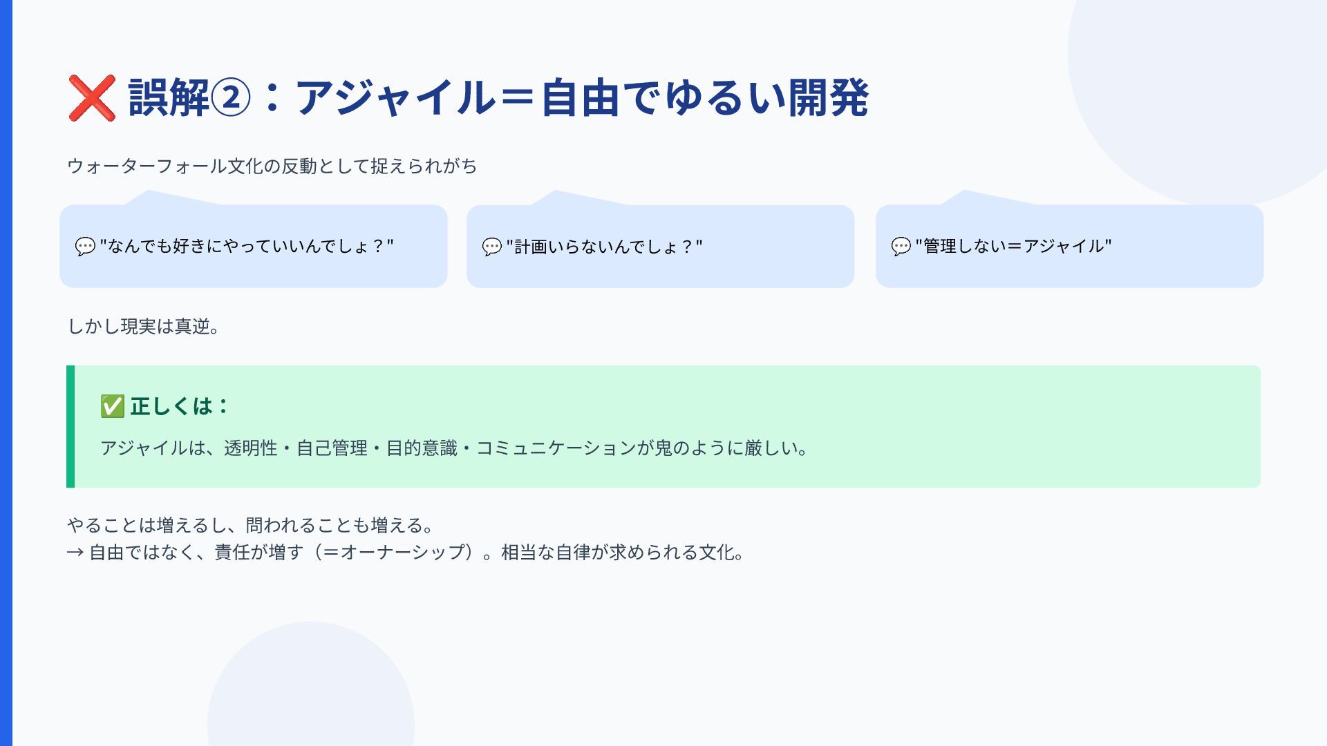 ❌ 誤解②:アジャイル=⾃由でゆるい開発 ウォーターフォール⽂化の反動として捉えられがち しかし現実は真逆。 やることは増えるし、問われることも増える。 → ⾃由ではなく、責任が増す(=オーナーシップ)。相当な⾃律が求められる⽂化。 ✅ 正しくは: アジャイルは、透明性‧⾃⼰管理‧⽬的意識‧コミュニケーションが⿁のように厳しい。