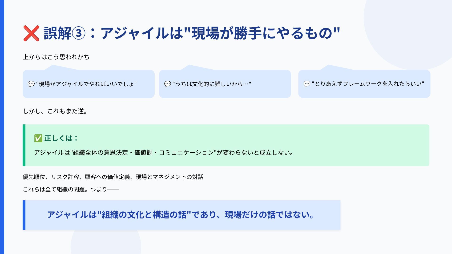 ✅ 正しくは: アジャイルは"組織全体の意思決定‧価値観‧コミュニケーション"が変わらないと成⽴しない。 ❌ 誤解③:アジャイルは"現場が勝⼿にやるもの" 上からはこう思われがち 💬 "現場がアジャイルでやればいいでしょ" 💬 "うちは⽂化的に難しいから…"