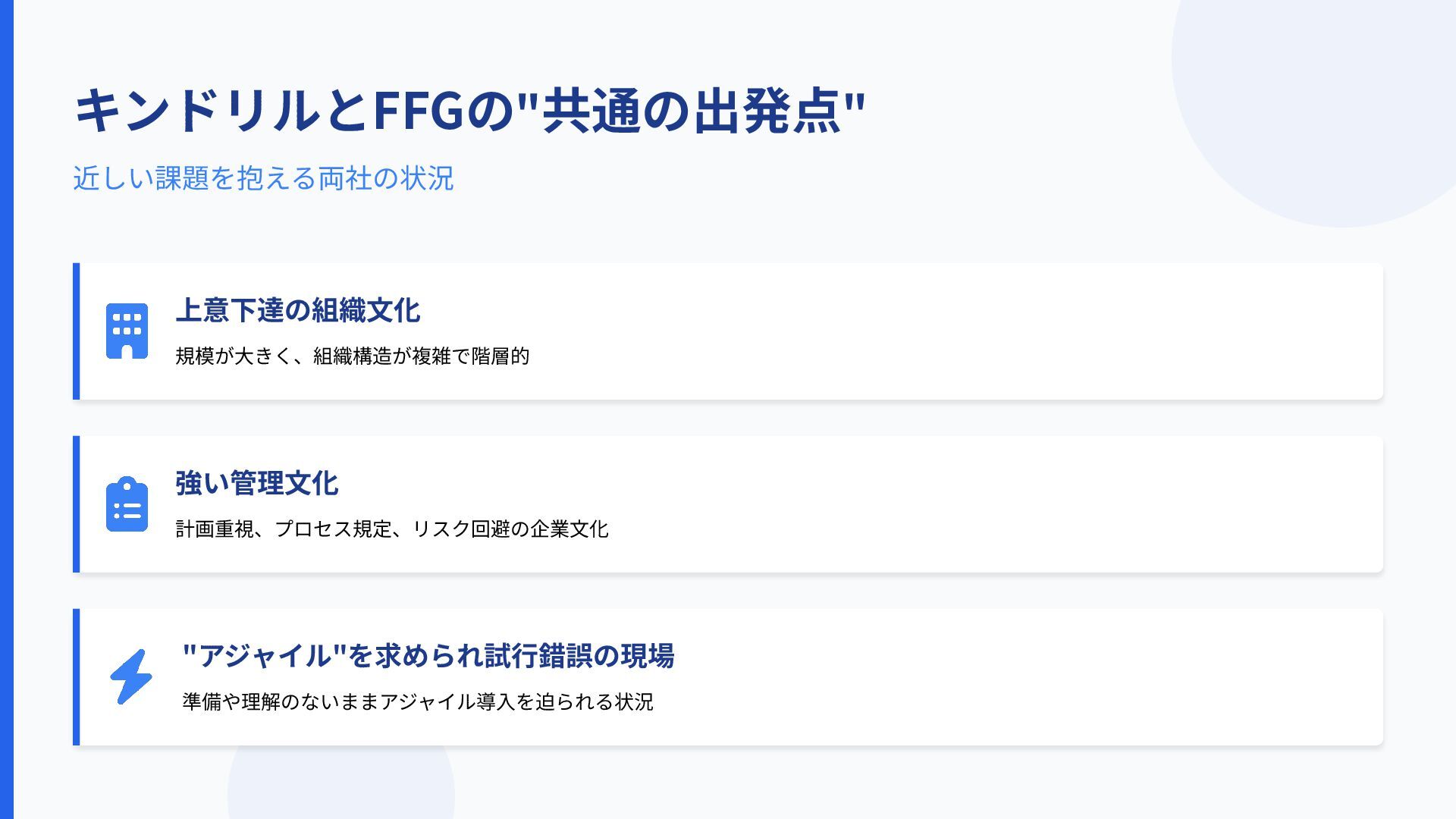 キンドリルとFFGの"共通の出発点" 近しい課題を抱える両社の状況 上意下達の組織⽂化 強い管理⽂化 規模が⼤きく、組織構造が複雑で階層的 計画重視、プロセス規定、リスク回避の企業⽂化 "アジャイル"を求められ試⾏錯誤の現場 準備や理解のないままアジャイル導⼊を迫られる状況