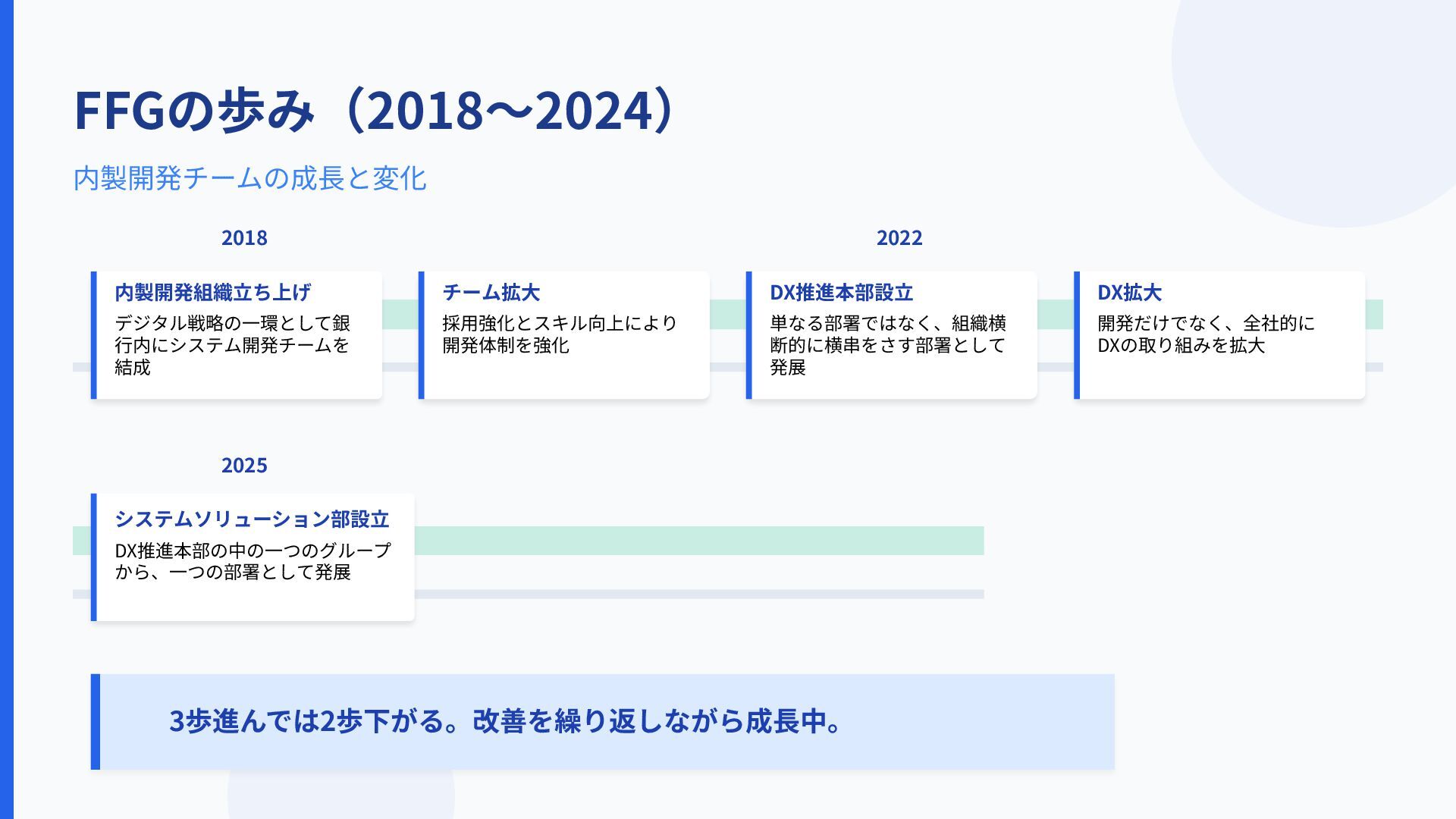 FFGの歩み(2018〜2024) 内製開発チームの成⻑と変化 2018 2022 内製開発組織⽴ち上げ チーム拡⼤ DX推進本部設⽴ デジタル戦略の⼀環として銀 ⾏内にシステム開発チームを 結成