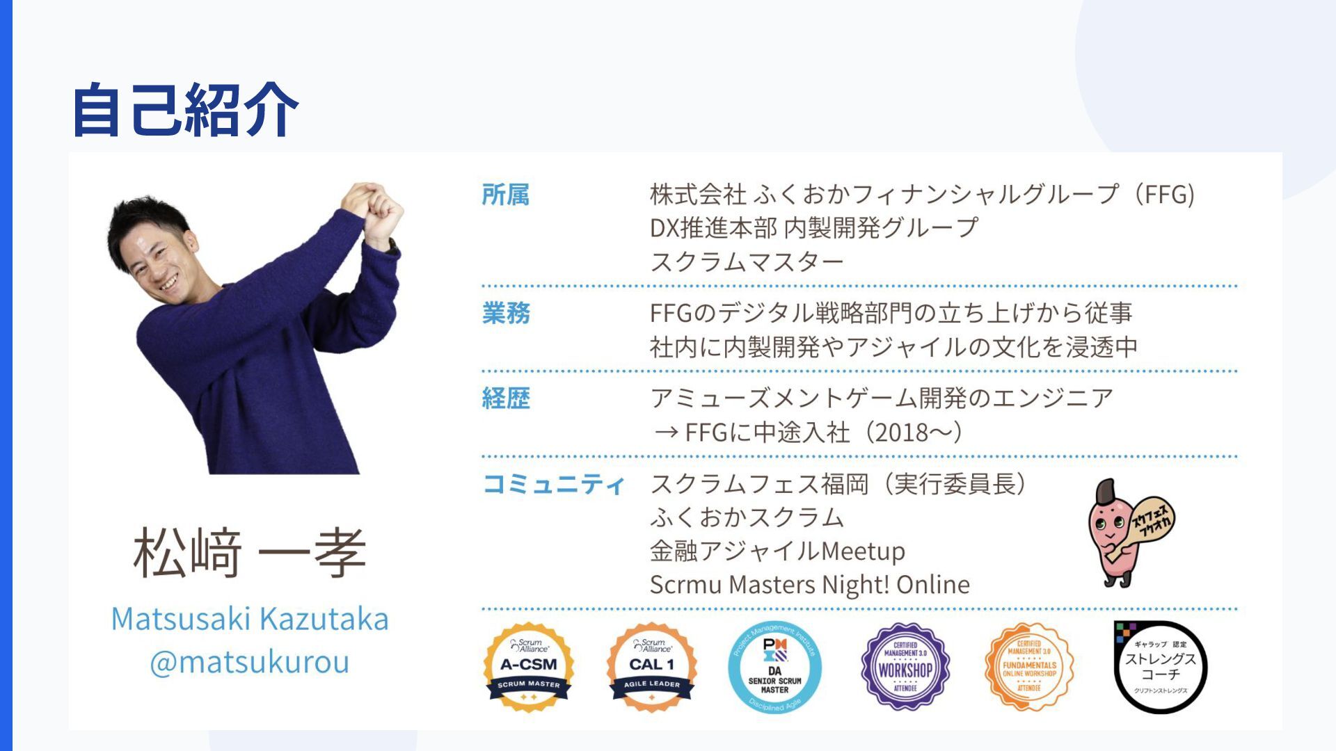 ⾃⼰紹介 ゲーム開発 銀⾏へ転⾝ スクラムマスター∕コミュニティ活動 「スクラムフェス福岡」「ふくおかスクラム」主催 銀⾏でアジャイルを実践中 松﨑 ⼀孝