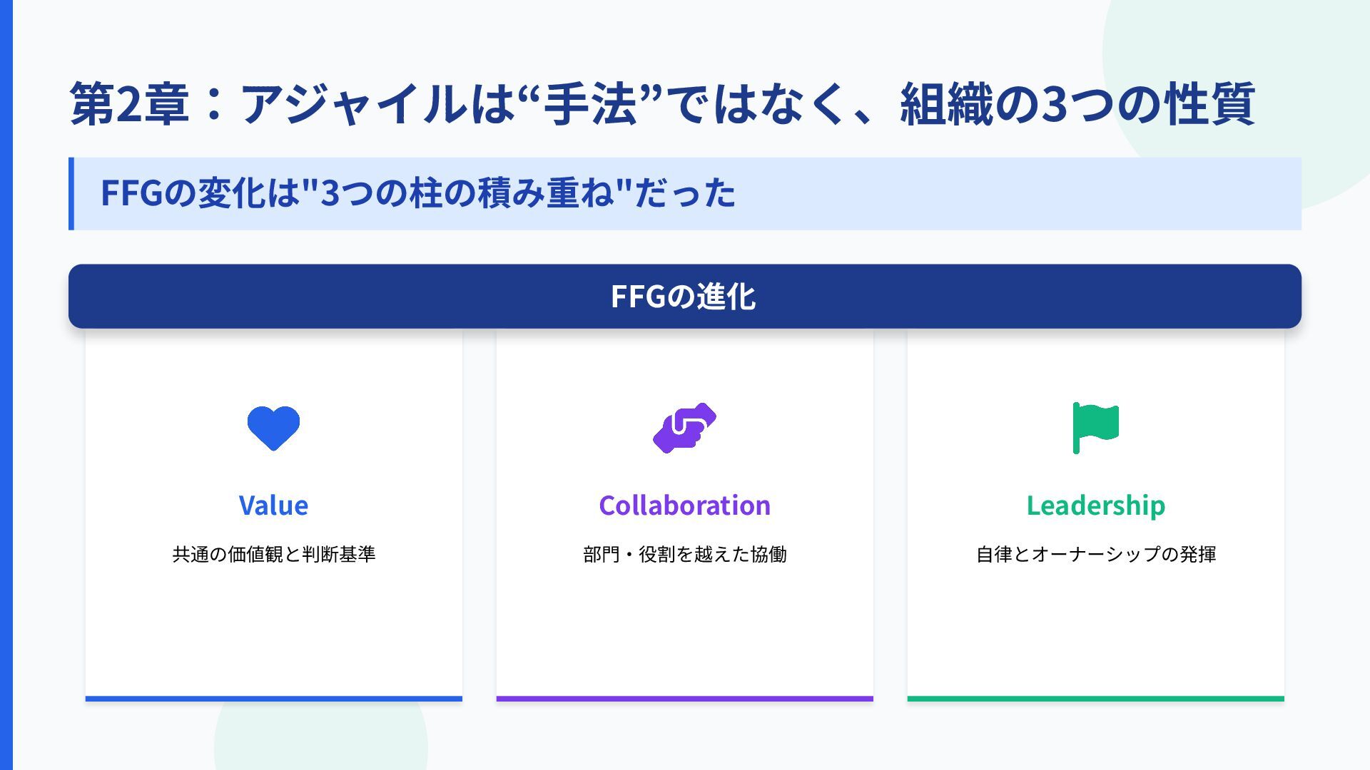第2章:アジャイルは“⼿法”ではなく、組織の3つの性質 劇的な転換ではなく、⼩さな積み上げが組織を変えた Value 共通の価値観と判断基準 Collaboration 部⾨‧役割を越えた協働 Leadership ⾃律とオーナーシップの発揮 FFGの進化 FFGの変化は"3つの柱の積み重ね"だった