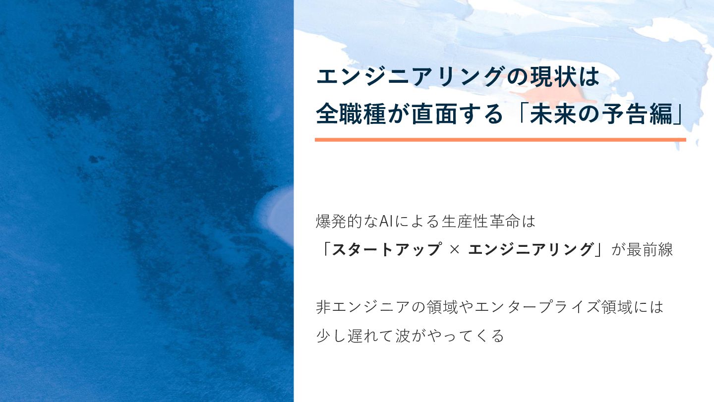 エンジニアリングの現状は 全職種が直面する「未来の予告編」 爆発的なAIによる生産性革命は 「スタートアップ × エンジニアリング」が最前線 非エンジニアの領域やエンタープライズ領域には 少し遅れて波がやってくる