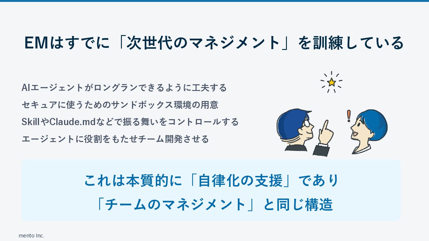 mento Inc. EMはすでに「次世代のマネジメント」を訓練している AIエージェントがロングランできるように工夫する セキュアに使うためのサンドボックス環境の用意 SkillやClaude.mdなどで振る舞いをコントロールする エージェントに役割をもたせチーム開発させる これは本質的に「自律化の支援」であり 「チームのマネジメント」と同じ構造