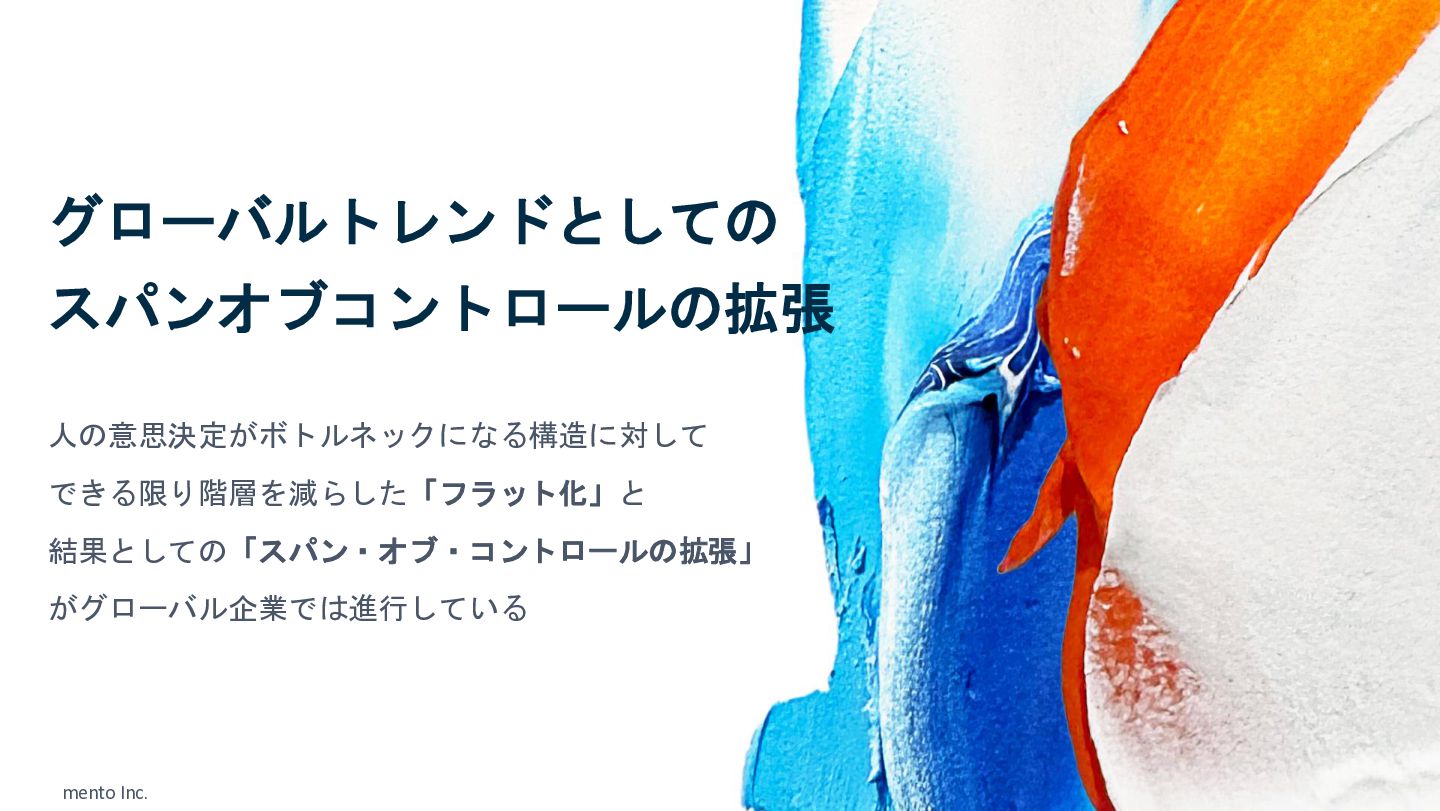 mento Inc. グローバルトレンドとしての スパンオブコントロールの拡張 人の意思決定がボトルネックになる構造に対して できる限り階層を減らした「フラット化」と 結果としての「スパン・オブ・コントロールの拡張」 がグローバル企業では進行している