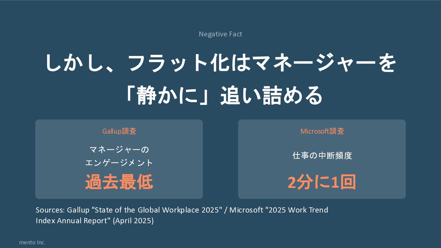 mento Inc. Negative Fact しかし、フラット化はマネージャーを 「静かに」追い詰める Gallup調査 マネージャーの エンゲージメント 過去最低
