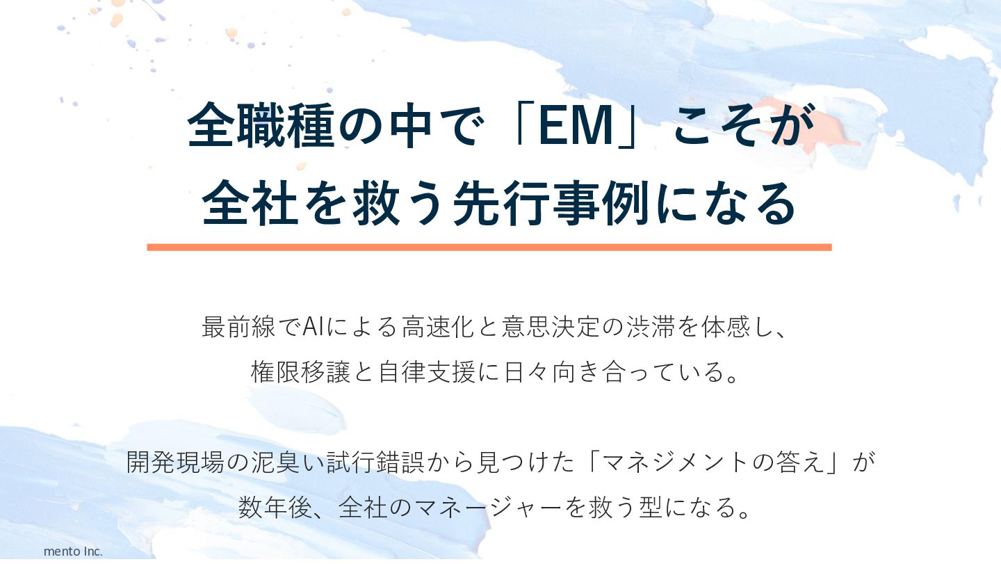 mento Inc. ★ 全職種の中で「EM」こそが 全社を救う先行事例になる 最前線でAIによる高速化と意思決定の渋滞を体感し、 権限移譲と自律支援に日々向き合っている。 開発現場の泥臭い試行錯誤から見つけた「マネジメントの答え」が 数年後、全社のマネージャーを救う型になる。