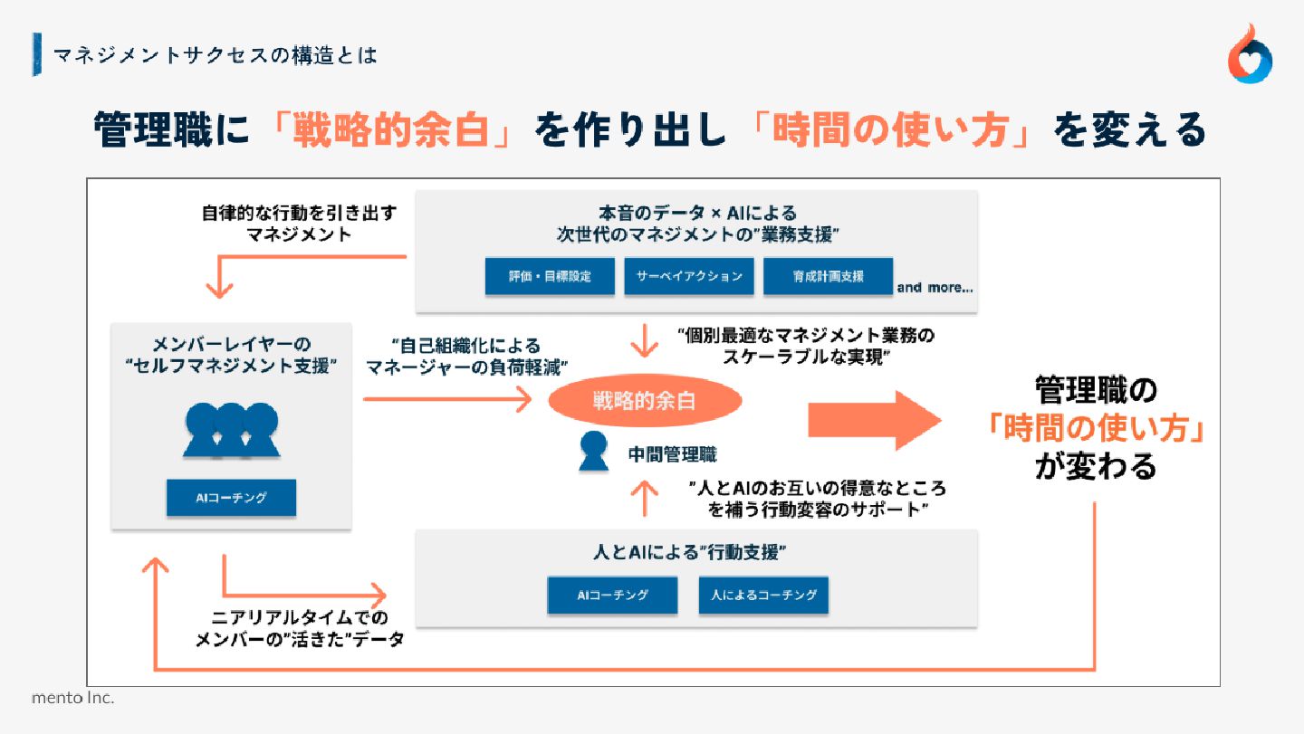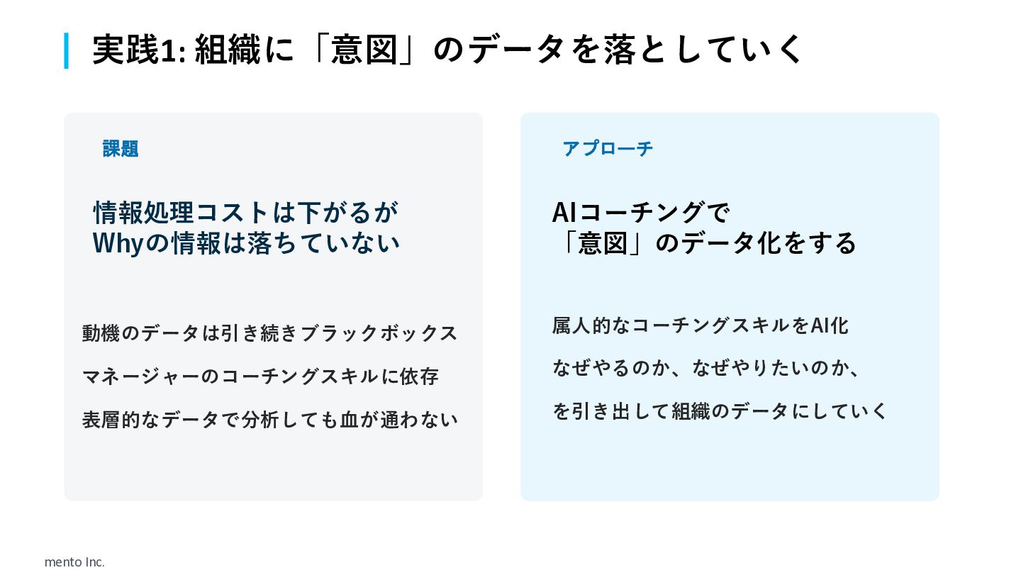 mento Inc. 課題 情報処理コストは下がるが Whyの情報は落ちていない 動機のデータは引き続きブラックボックス マネージャーのコーチングスキルに依存 表層的なデータで分析しても血が通わない アプローチ AIコーチングで