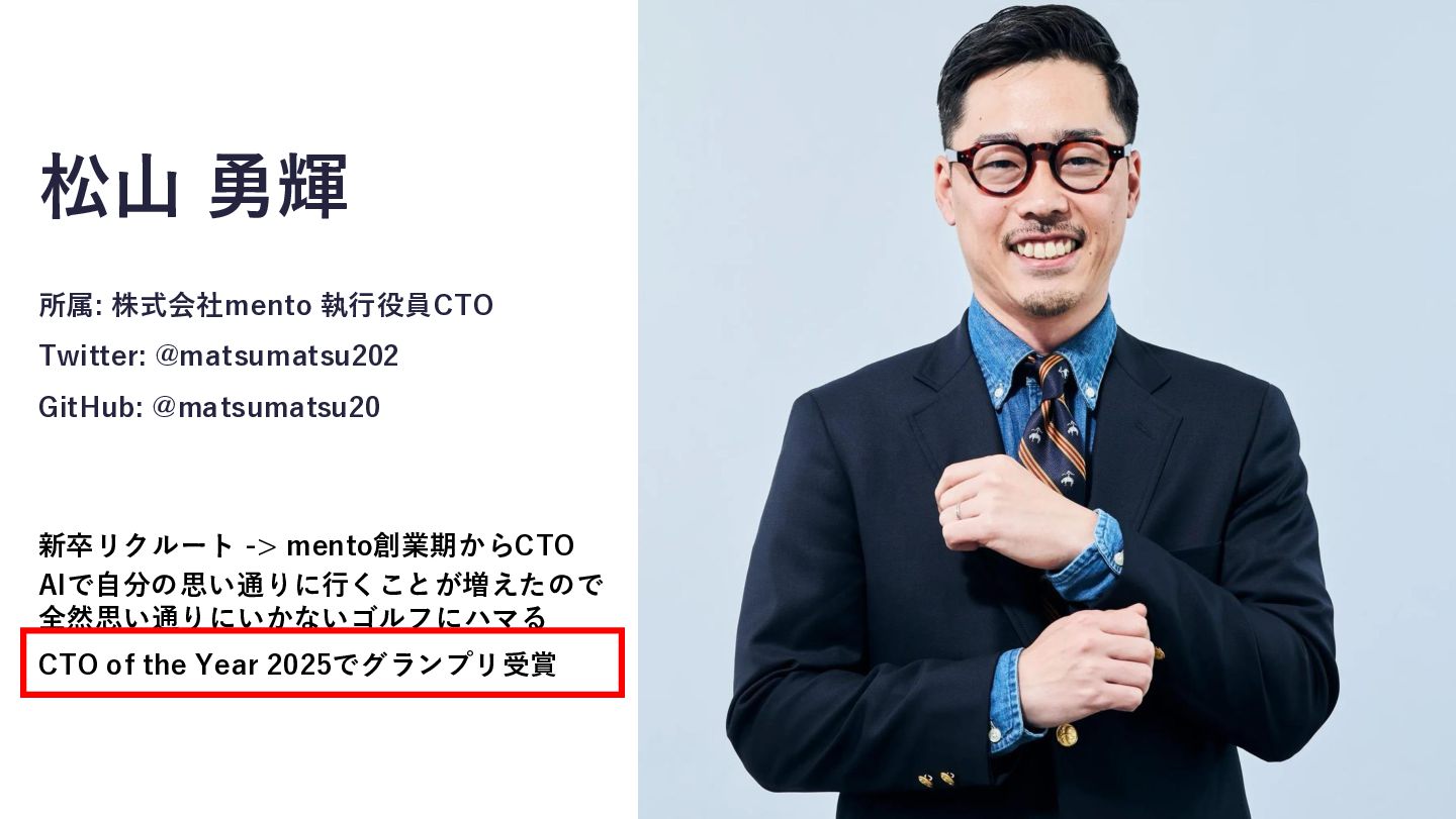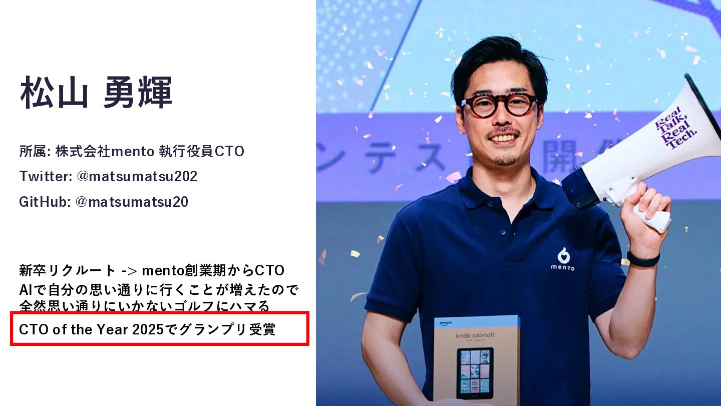 -> mento創業期からCTO AIで自分の思い通りに行くことが増えたので 全然思い通りにいかないゴルフにハマる CTO of the Year 2025でグランプリ受賞