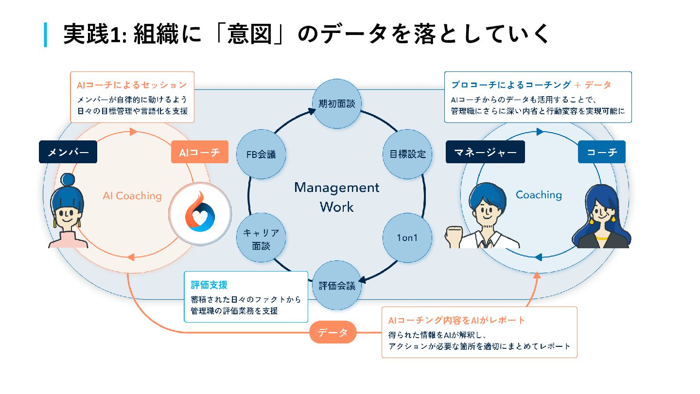 「意図」のデータ化をする 属人的なコーチングスキルをAI化 なぜやるのか、なぜやりたいのか、 を引き出して組織のデータにしていく 実践1: 組織に「意図」のデータを落としていく