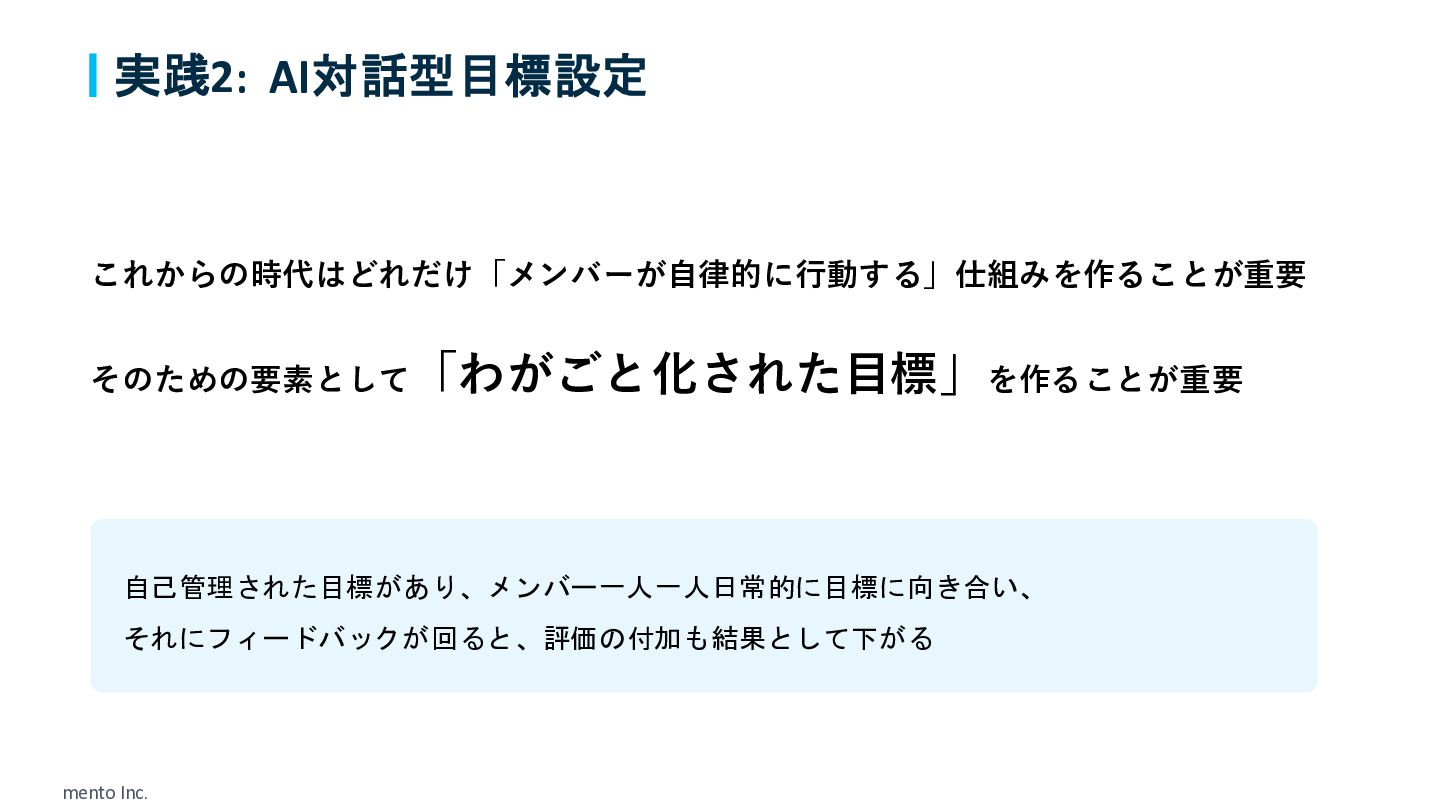 mento Inc. 実践2: AI対話型目標設定 これからの時代はどれだけ「メンバーが自律的に行動する」仕組みを作ることが重要 そのための要素として「わがごと化された目標」を作ることが重要 自己管理された目標があり、メンバー一人一人日常的に目標に向き合い、 それにフィードバックが回ると、評価の付加も結果として下がる