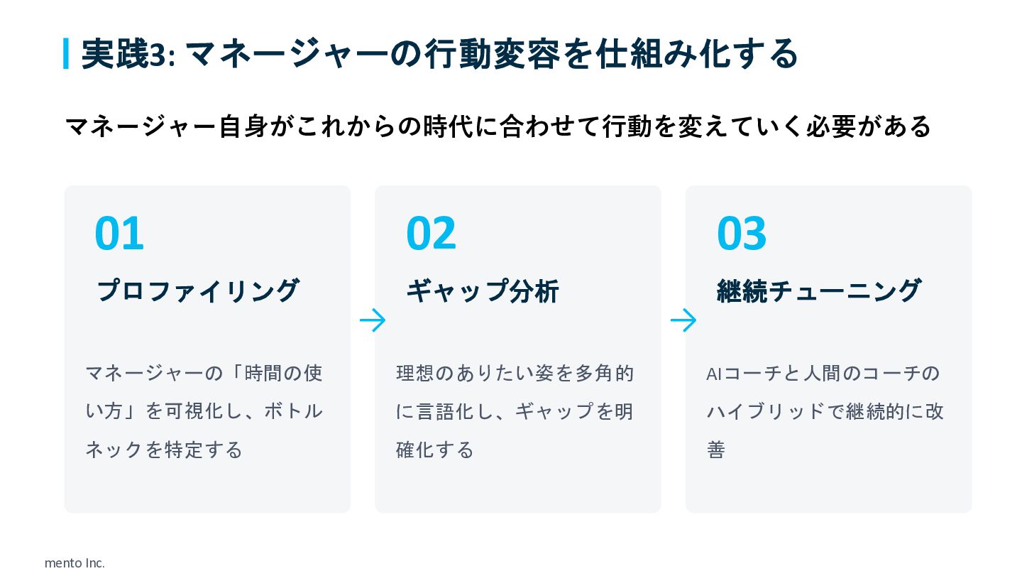 mento Inc. 実践3: マネージャーの行動変容を仕組み化する 01 プロファイリング マネージャーの「時間の使 い方」を可視化し、ボトル ネックを特定する 02