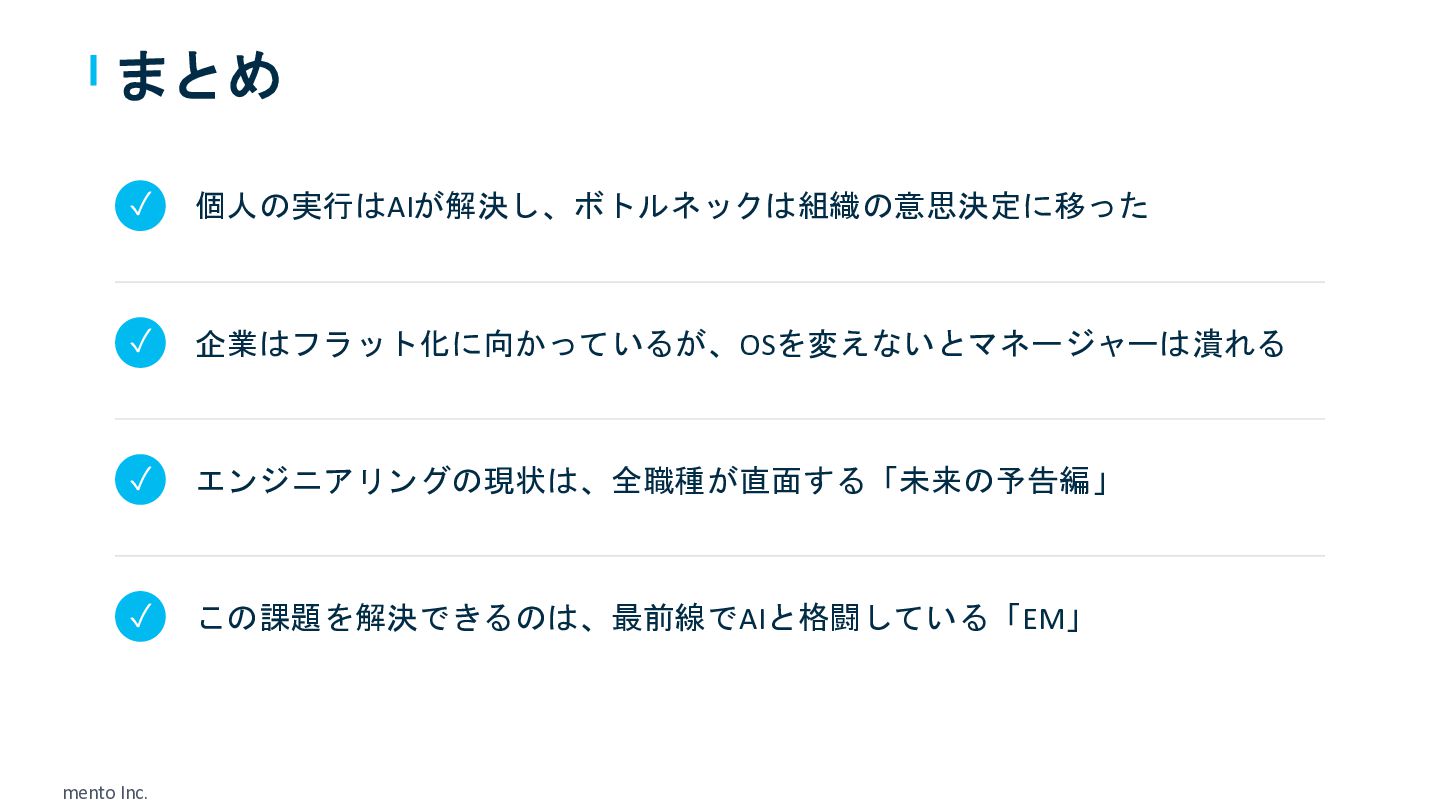 mento Inc. まとめ ✓ 個人の実行はAIが解決し、ボトルネックは組織の意思決定に移った ✓ 企業はフラット化に向かっているが、OSを変えないとマネージャーは潰れる ✓ エンジニアリングの現状は、全職種が直面する「未来の予告編」 ✓