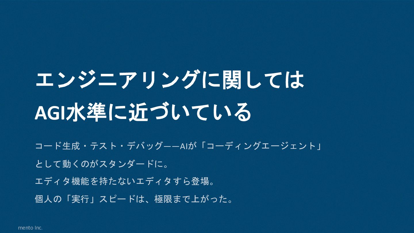 mento Inc. エンジニアリングに関しては AGI水準に近づいている コード生成・テスト・デバッグ——AIが「コーディングエージェント」 として動くのがスタンダードに。 エディタ機能を持たないエディタすら登場。 個人の「実行」スピードは、極限まで上がった。