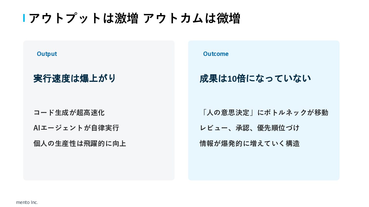 mento Inc. Output 実行速度は爆上がり コード生成が超高速化 AIエージェントが自律実行 個人の生産性は飛躍的に向上 Outcome 成果は10倍になっていない 「人の意思決定」にボトルネックが移動