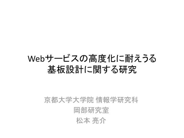 3. リソースの分離[論文執筆中] → mod_resource_manager 4. 大規模・高集積・運用[3] → インフラ設計 – 大規模・高集積かつ高いセキュリティと性能を両立 – 運用性も高く、Webサーバの機能拡張も容易 [1] 松本亮介・岡部寿男, 組み込みスクリプト言語mrubyを利用したWebサーバの機能拡張支援機構, 情報処理学会研究報告 Vol.2012-IOT-18, No.6, 2012年6月. [2] Ryosuke Matsumoto, Yasuo Okabe, Access Control Architecture Separating Privilege by a Thread on a Web Server, The 12th IEEE/IPSJ International Symposium on Applications and the Internet (SAINT2012), pp.178-183, July 2012. [3] 松本亮介, 川原将司, 松岡輝夫, “汎用性の高い大規模共有型Webバーチャルホスティング基盤のセキュリティと運用技術の改善”,情報処理学会論文 誌,Vol.54, No.3, (2013-3 掲載予定). 4
