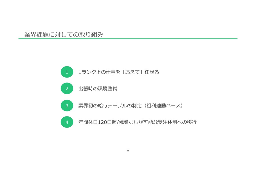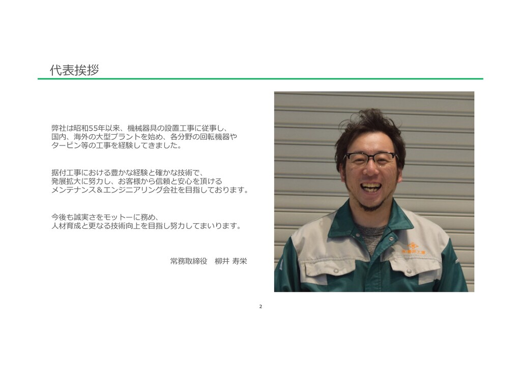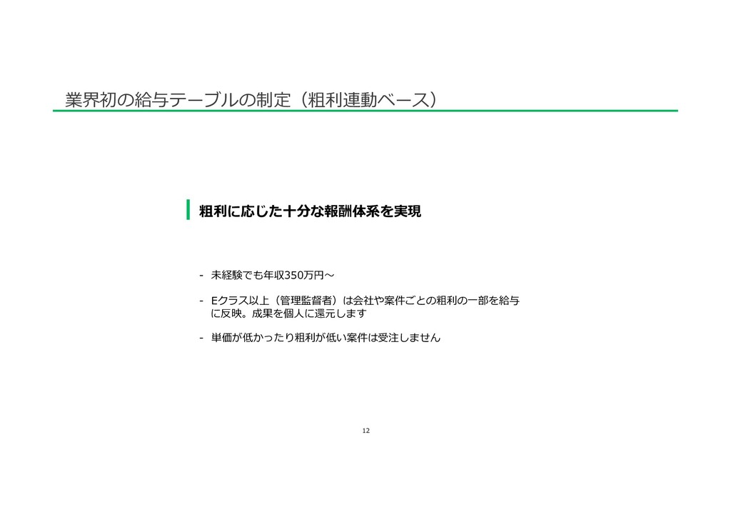 Aクラス 400 600 800 1,000 جຊڅ 500-600ສ جຊڅ 350-450ສ Sクラス Eクラス جຊڅ800ສ ࢧళͷ ૈར30% 1,100 جຊڅ500ສ 業界初の給与テーブルの制定(粗利連動ベース)※グラフ E1:300万円以上の請負⼯事を任せられる E2:500万円以上の請負⼯事を任せられる E3:1000万円以上の請負⼯事を任せられる C1:⽚持ちポンプ、両持ちポンプ、ファンの構造を理解し、O/Hができる。 C2:ブロワー、撹拌機、多段ポンプの構造を理解し、O/Hができる。 C3:各タービン、レシプロ、その他特殊機械 の構造を理解し、O/Hができる。 A1:道具、⼯具の名称、使い⽅を理解している A2:回転機及び部品の種類や特性、その⽤途の違いが理解できる 分解部品の整備⽅法を理解している。 芯出しができる。 ⼀般回転機 (⼩型ポンプ、ファン、ブロワー)を簡易分解できる。 ※アドバイス有 A3:図⾯を⾒ることができる。 メカの組⽴・押し代の計算ができる。 ⼀般回転機 (⼩型ポンプ、ファン、ブロワー)をO/Hができる ※アドバイス無し。 ⽀店の収⽀、⼯事管理、⼈事、マネージメントができる Cクラス Aクラス Sクラス Eクラス