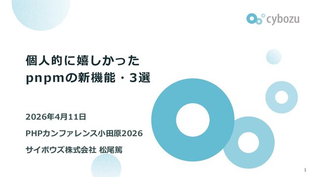 個人的に嬉しかった pnpmの新機能・3選 2026年4月11日 PHPカンファレンス小田原2026 サイボウズ株式会社 松尾篤 1