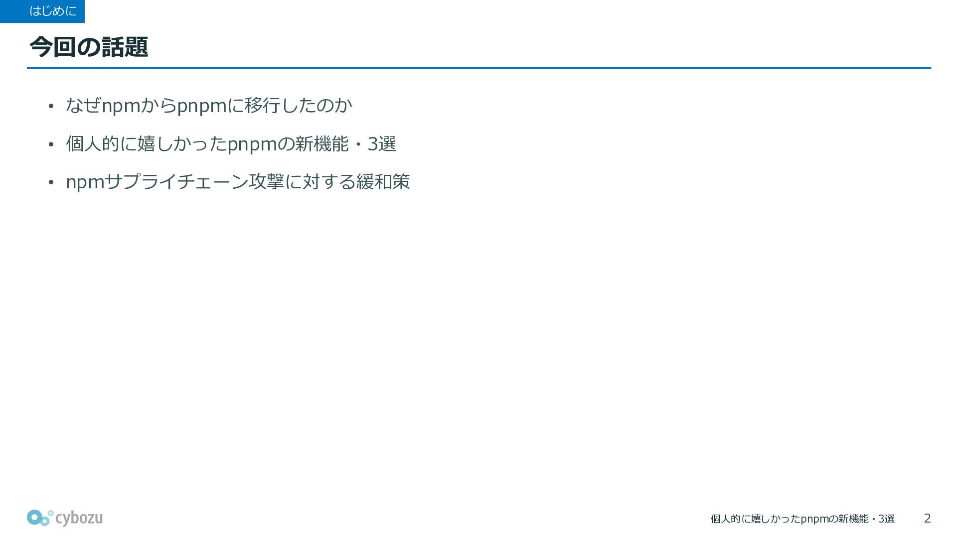個人的に嬉しかったpnpmの新機能・3選 今回の話題 はじめに • なぜnpmからpnpmに移行したのか • 個人的に嬉しかったpnpmの新機能・3選 • npmサプライチェーン攻撃に対する緩和策 2