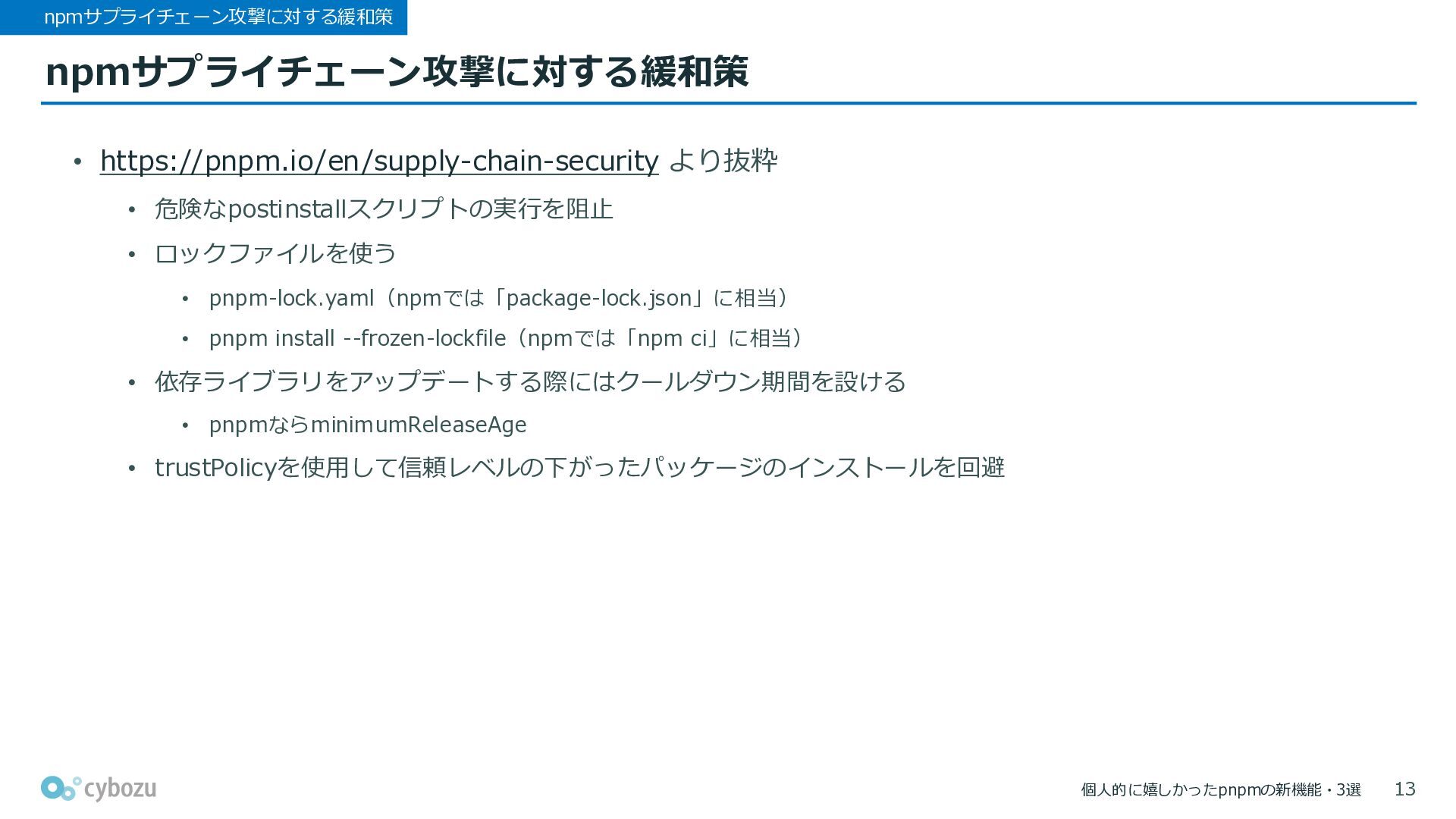 • pnpm-lock.yaml(npmでは「package-lock.json」に相当) • pnpm install --frozen-lockfile(npmでは「npm ci」に相当) • 依存ライブラリをアップデートする際にはクールダウン期間を設ける • pnpmならminimumReleaseAge • trustPolicyを使用して信頼レベルの下がったパッケージのインストールを回避 13
