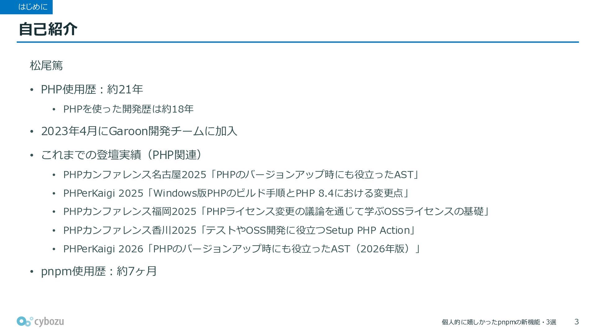 • これまでの登壇実績(PHP関連) • PHPカンファレンス名古屋2025「PHPのバージョンアップ時にも役立ったAST」 • PHPerKaigi 2025「Windows版PHPのビルド手順とPHP 8.4における変更点」 • PHPカンファレンス福岡2025「PHPライセンス変更の議論を通じて学ぶOSSライセンスの基礎」 • PHPカンファレンス香川2025「テストやOSS開発に役立つSetup PHP Action」 • PHPerKaigi 2026「PHPのバージョンアップ時にも役立ったAST(2026年版)」 • pnpm使用歴:約7ヶ月 3