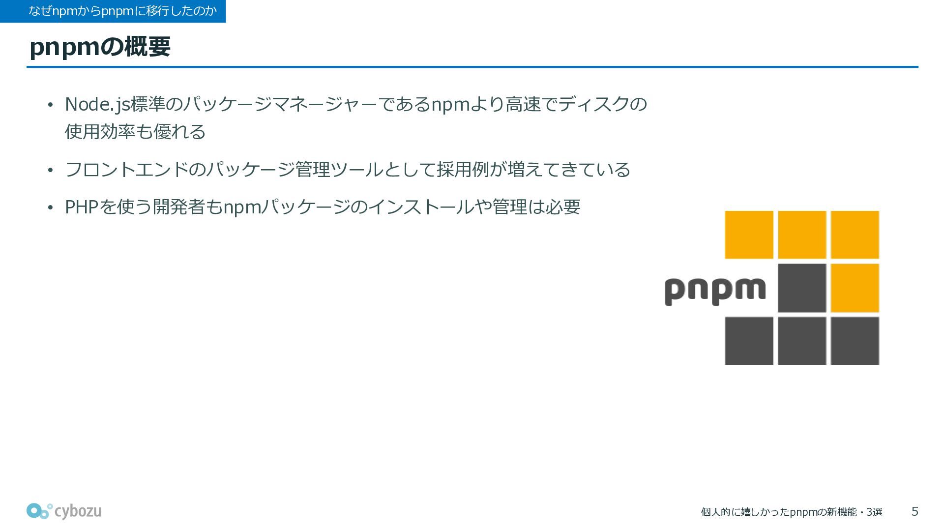 個人的に嬉しかったpnpmの新機能・3選 pnpmの概要 なぜnpmからpnpmに移行したのか • Node.js標準のパッケージマネージャーであるnpmより高速でディスクの 使用効率も優れる • フロントエンドのパッケージ管理ツールとして採用例が増えてきている • PHPを使う開発者もnpmパッケージのインストールや管理は必要