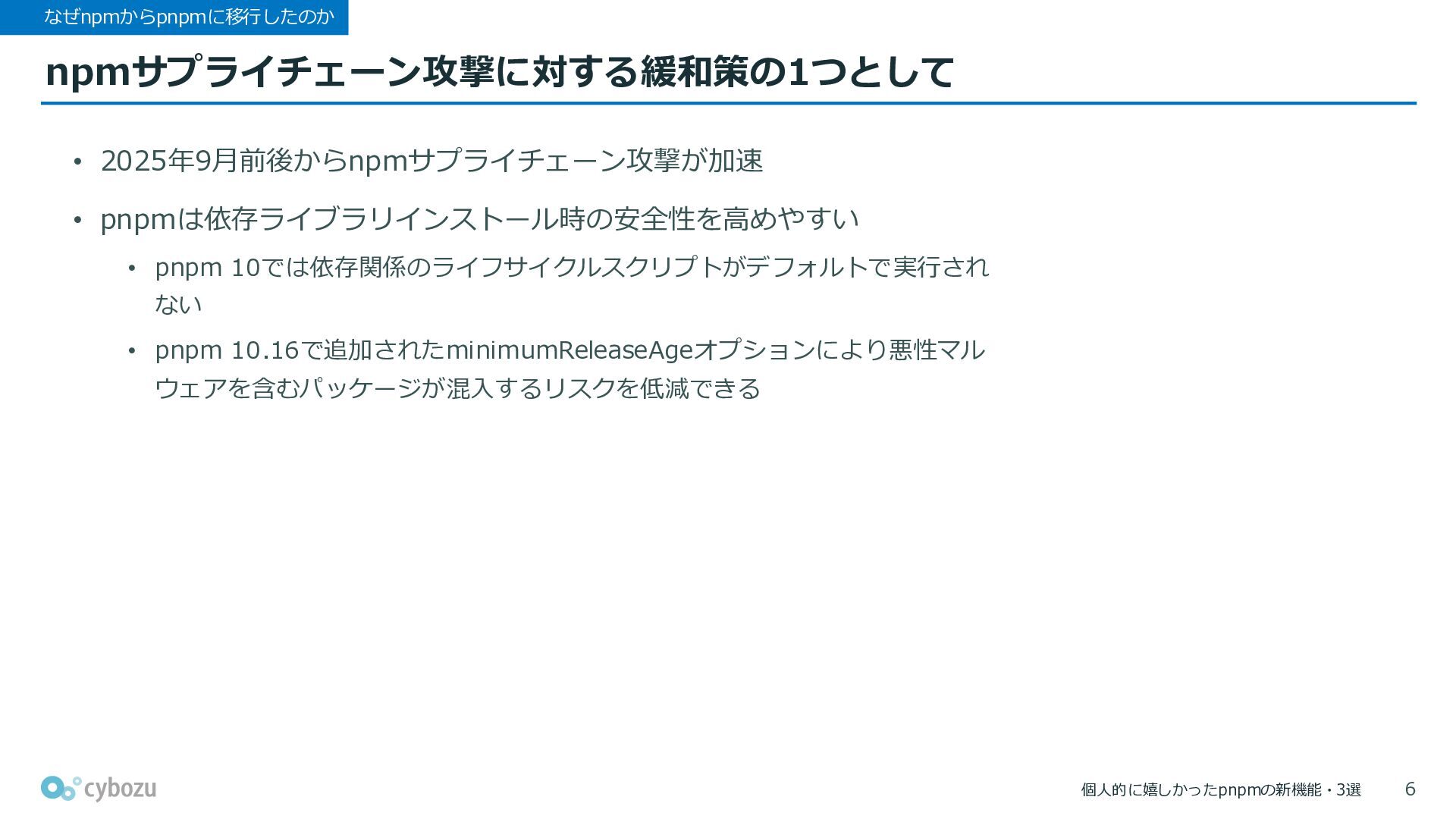 個人的に嬉しかったpnpmの新機能・3選 npmサプライチェーン攻撃に対する緩和策の1つとして なぜnpmからpnpmに移行したのか • 2025年9月前後からnpmサプライチェーン攻撃が加速 • pnpmは依存ライブラリインストール時の安全性を高めやすい • pnpm 10では依存関係のライフサイクルスクリプトがデフォルトで実行され