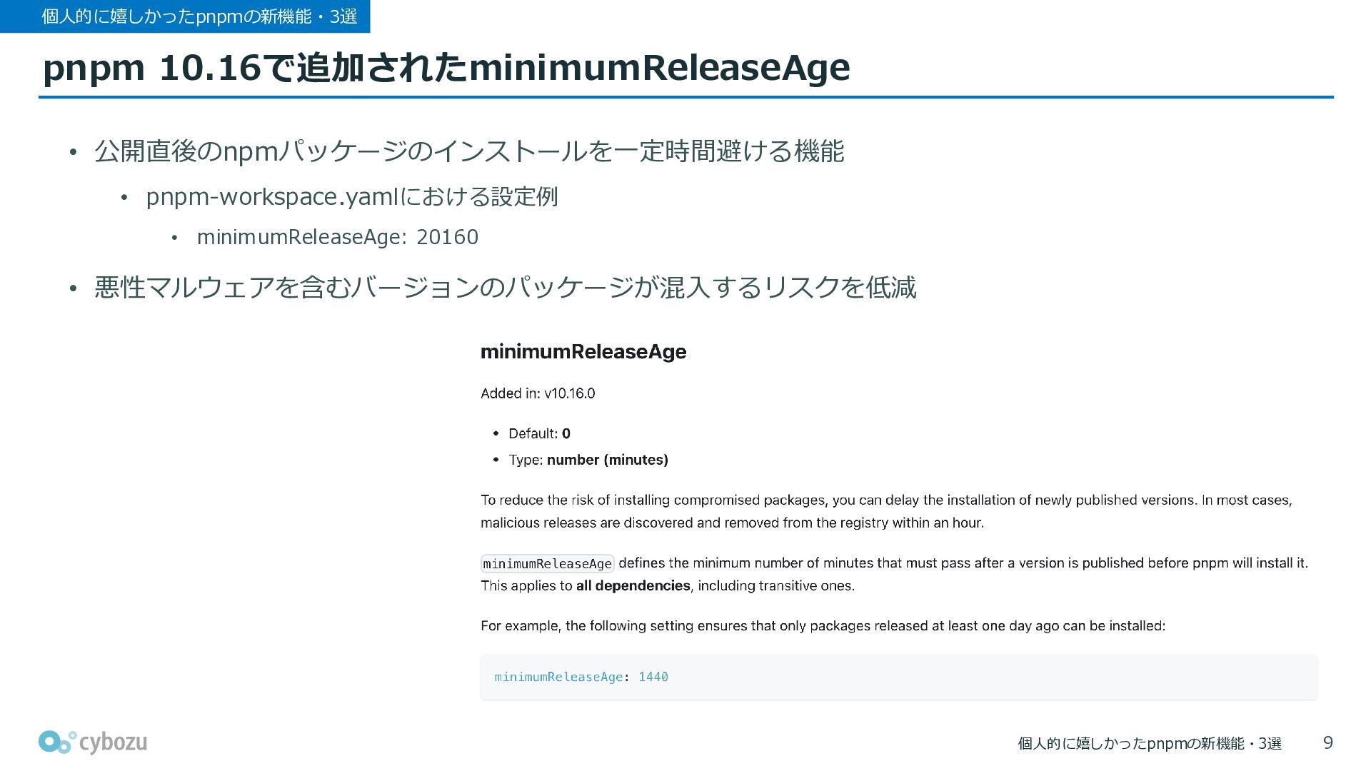 個人的に嬉しかったpnpmの新機能・3選 pnpm 10.16で追加されたminimumReleaseAge 個人的に嬉しかったpnpmの新機能・3選 • 公開直後のnpmパッケージのインストールを一定時間避ける機能 • pnpm-workspace.yamlにおける設定例 • minimumReleaseAge: