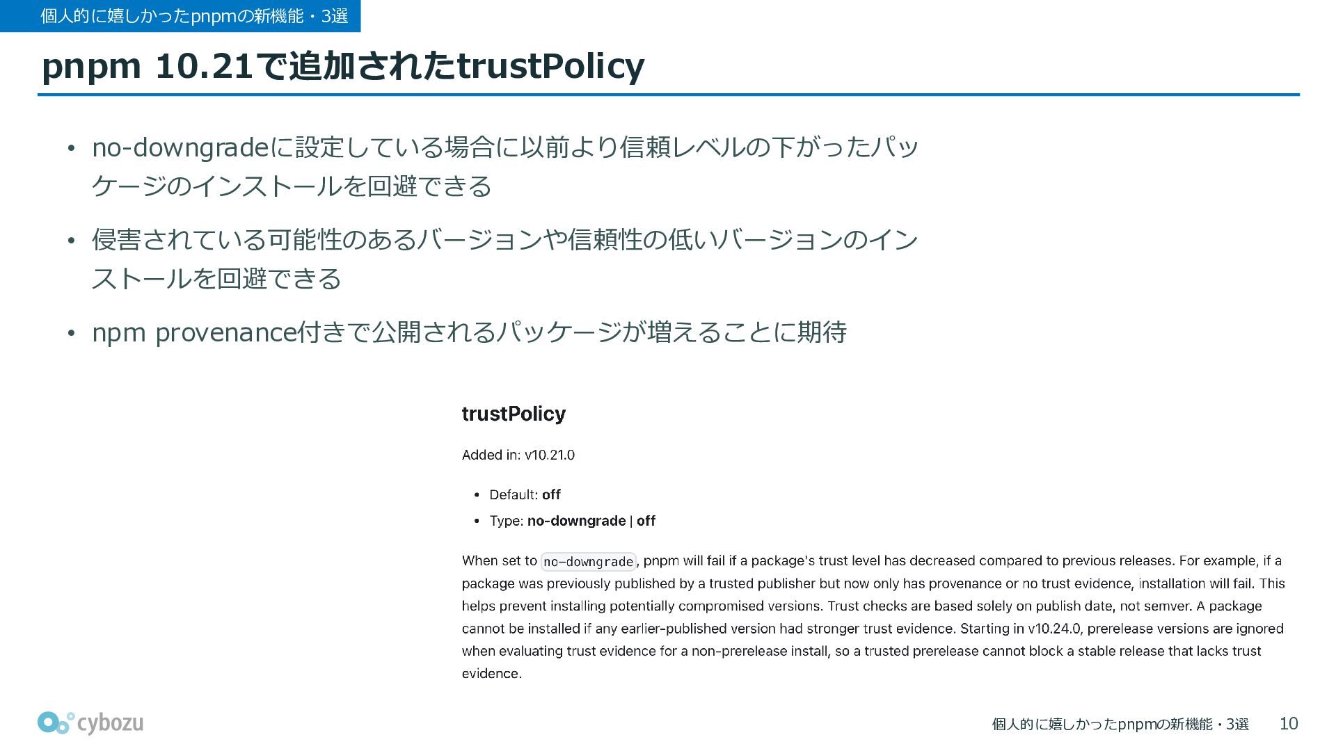 個人的に嬉しかったpnpmの新機能・3選 pnpm 10.21で追加されたtrustPolicy 個人的に嬉しかったpnpmの新機能・3選 • no-downgradeに設定している場合に以前より信頼レベルの下がったパッ ケージのインストールを回避できる • 侵害されている可能性のあるバージョンや信頼性の低いバージョンのイン ストールを回避できる