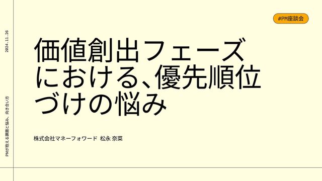価値創出フェーズ における、 優先順位 づけの悩み 株式会社マネーフォワード 松永 奈菜 PMが抱える課題と悩み、向き合い方 2024.11.26 #PM座談会