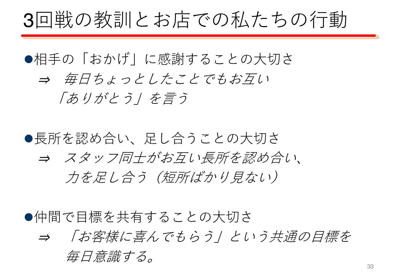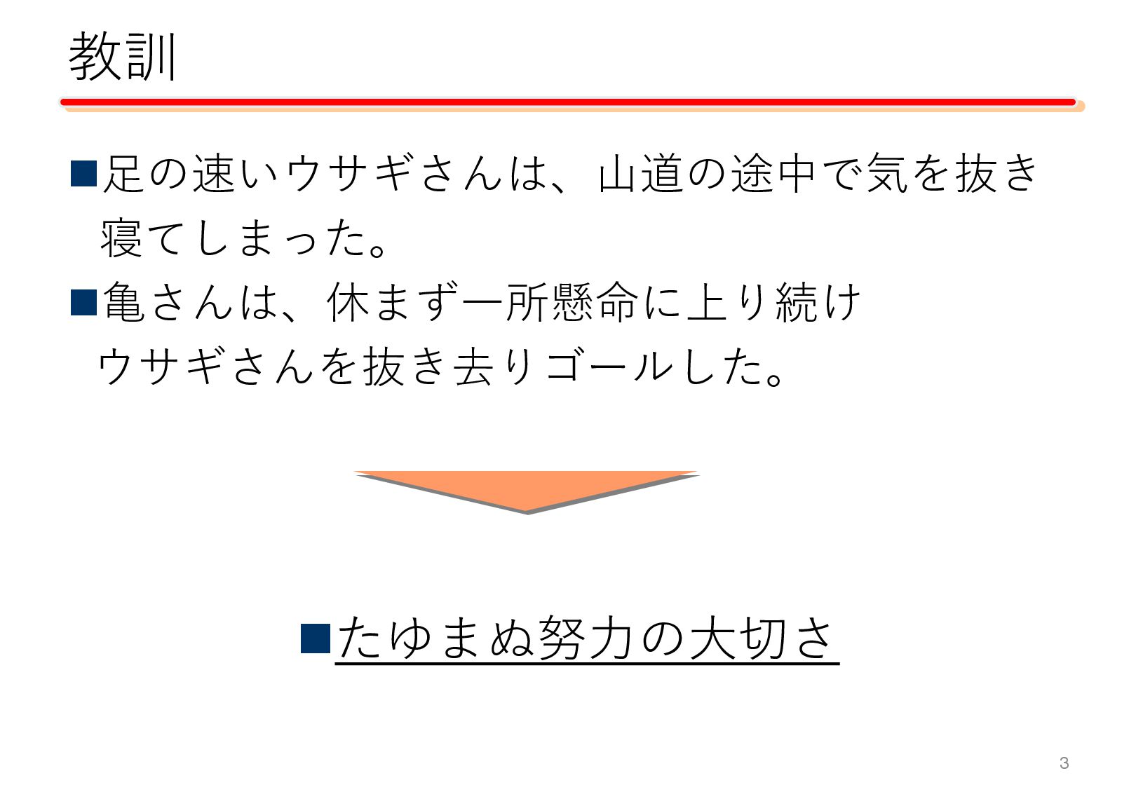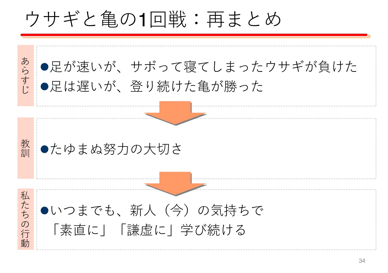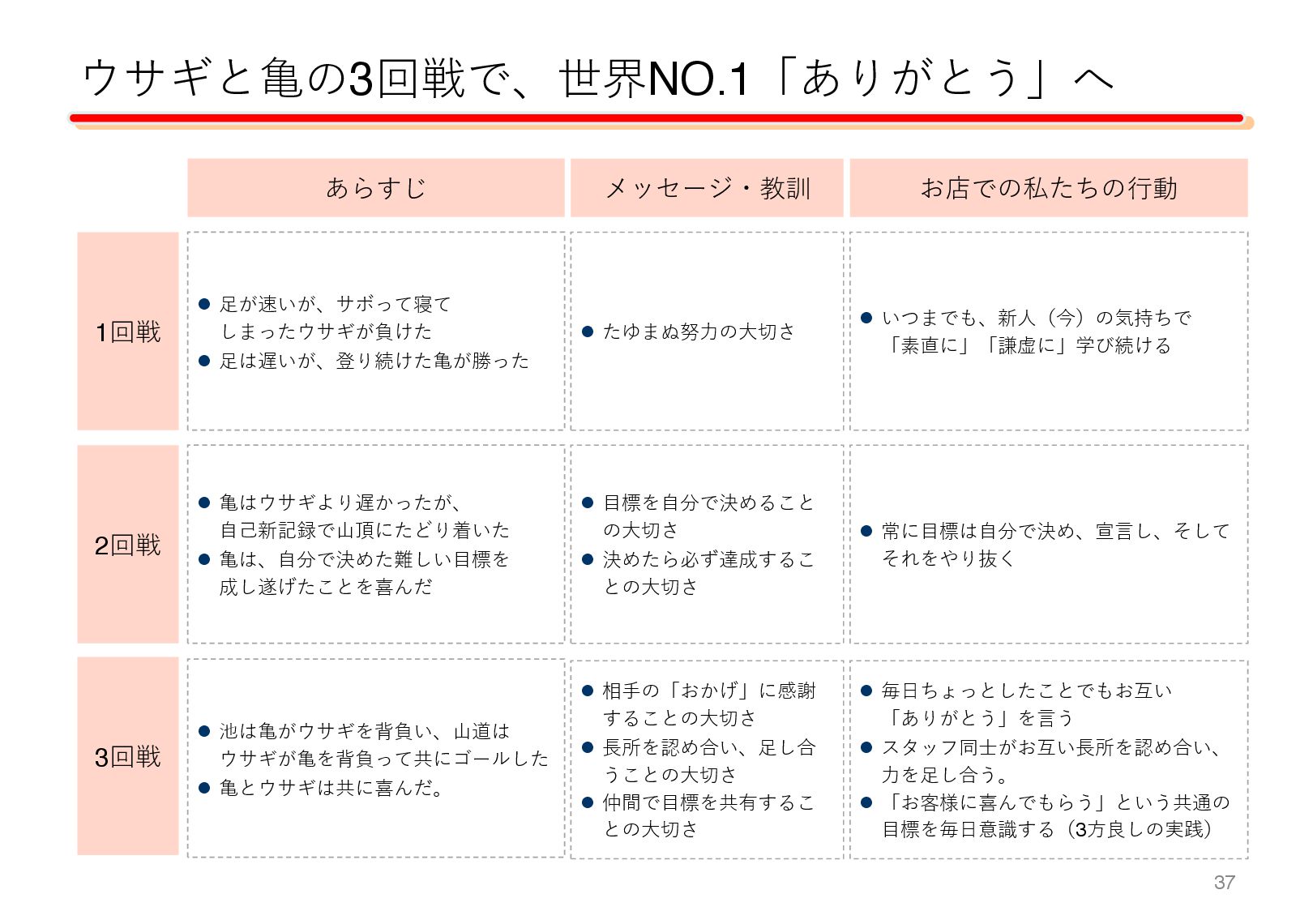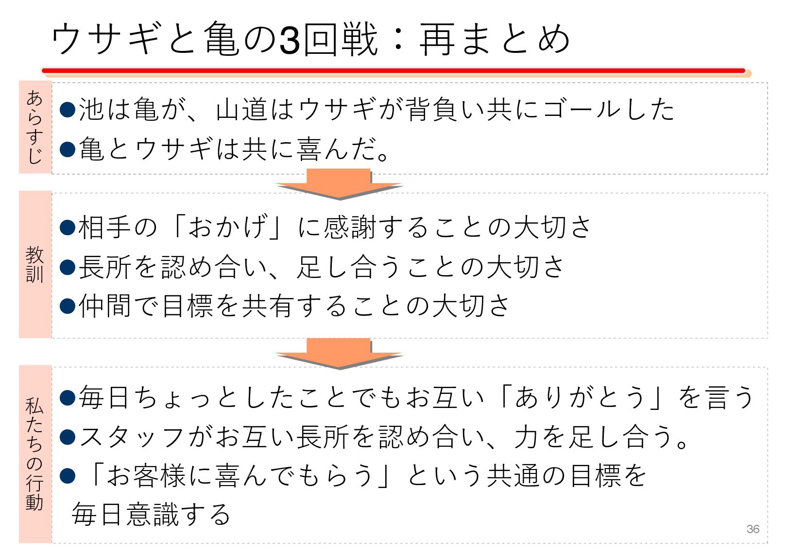 の⼤切さ l 決めたら必ず達成するこ との⼤切さ l 相⼿の「おかげ」に感謝 することの⼤切さ l ⻑所を認め合い、⾜し合 うことの⼤切さ l 仲間で⽬標を共有するこ との⼤切さ l いつまでも、新⼈(今)の気持ちで 「素直に」「謙虚に」学び続ける l 常に⽬標は⾃分で決め、宣⾔し、そして それをやり抜く l 毎⽇ちょっとしたことでもお互い 「ありがとう」を⾔う l スタッフ同⼠がお互い⻑所を認め合い、 ⼒を⾜し合う。 l 「お客様に喜んでもらう」という共通の ⽬標を毎⽇意識する(3⽅良しの実践) 37 あらすじ l ⾜が速いが、サボって寝て しまったウサギが負けた l ⾜は遅いが、登り続けた⻲が勝った l ⻲はウサギより遅かったが、 ⾃⼰新記録で⼭頂にたどり着いた l ⻲は、⾃分で決めた難しい⽬標を 成し遂げたことを喜んだ l 池は⻲がウサギを背負い、⼭道は ウサギが⻲を背負って共にゴールした l ⻲とウサギは共に喜んだ。