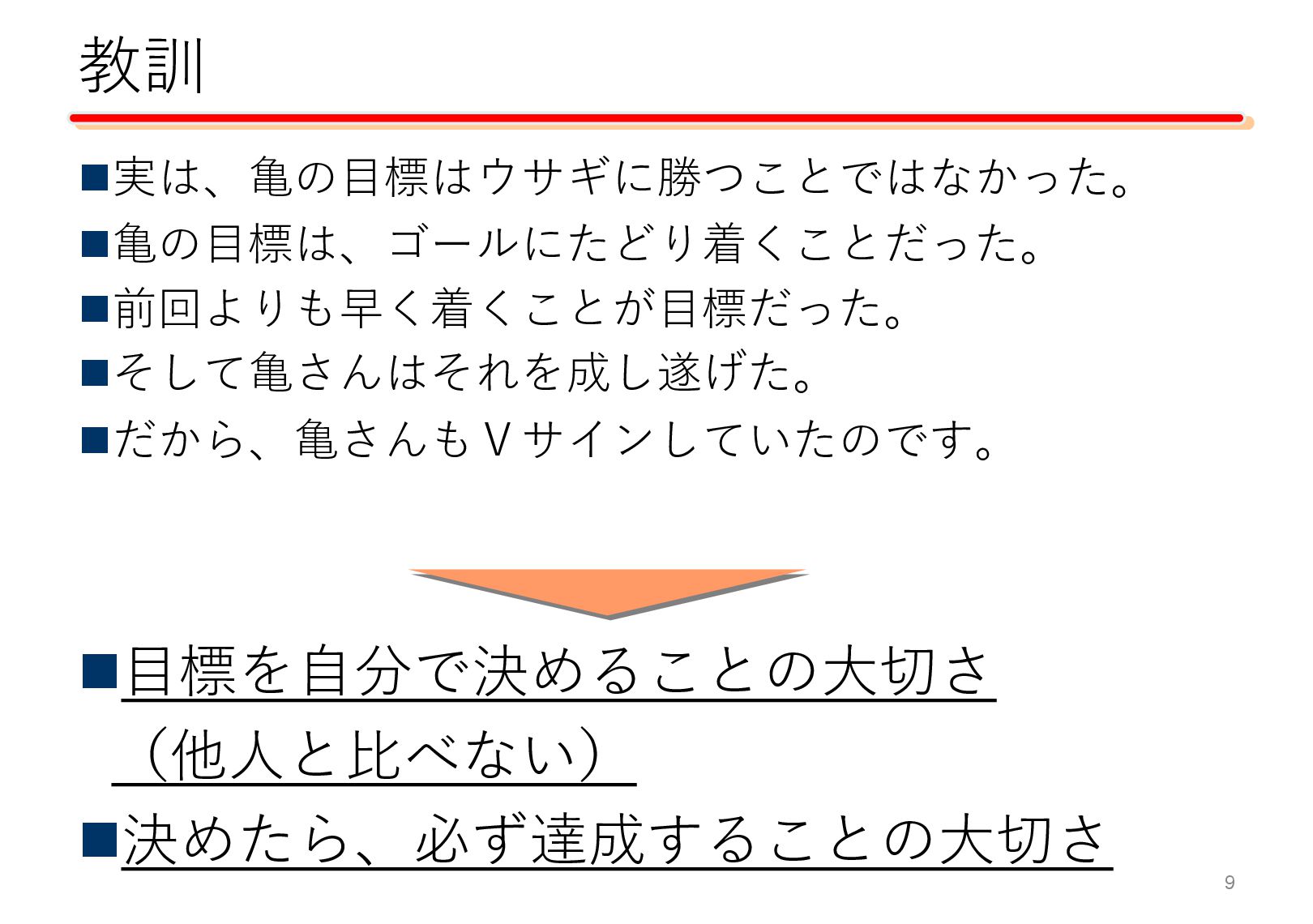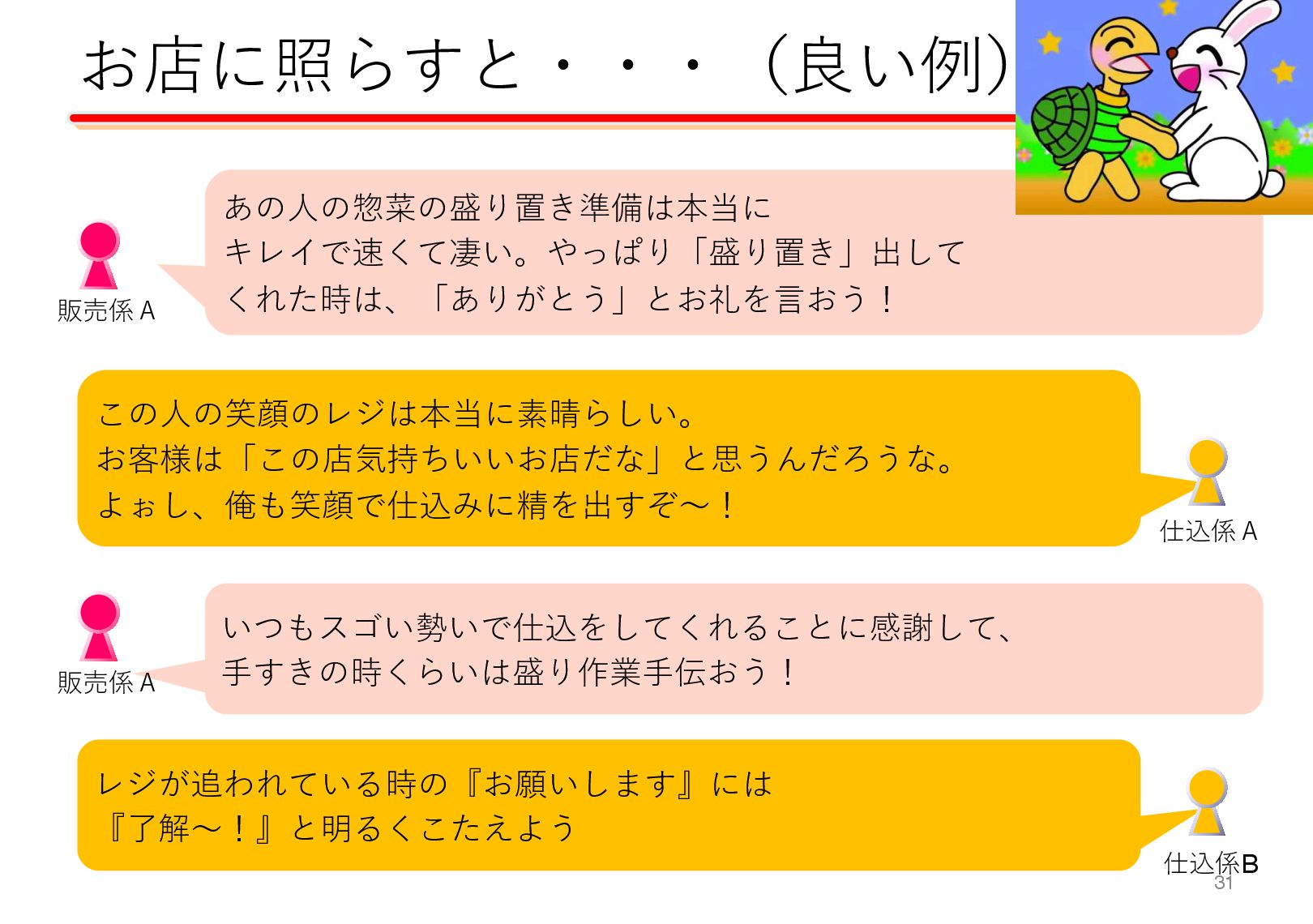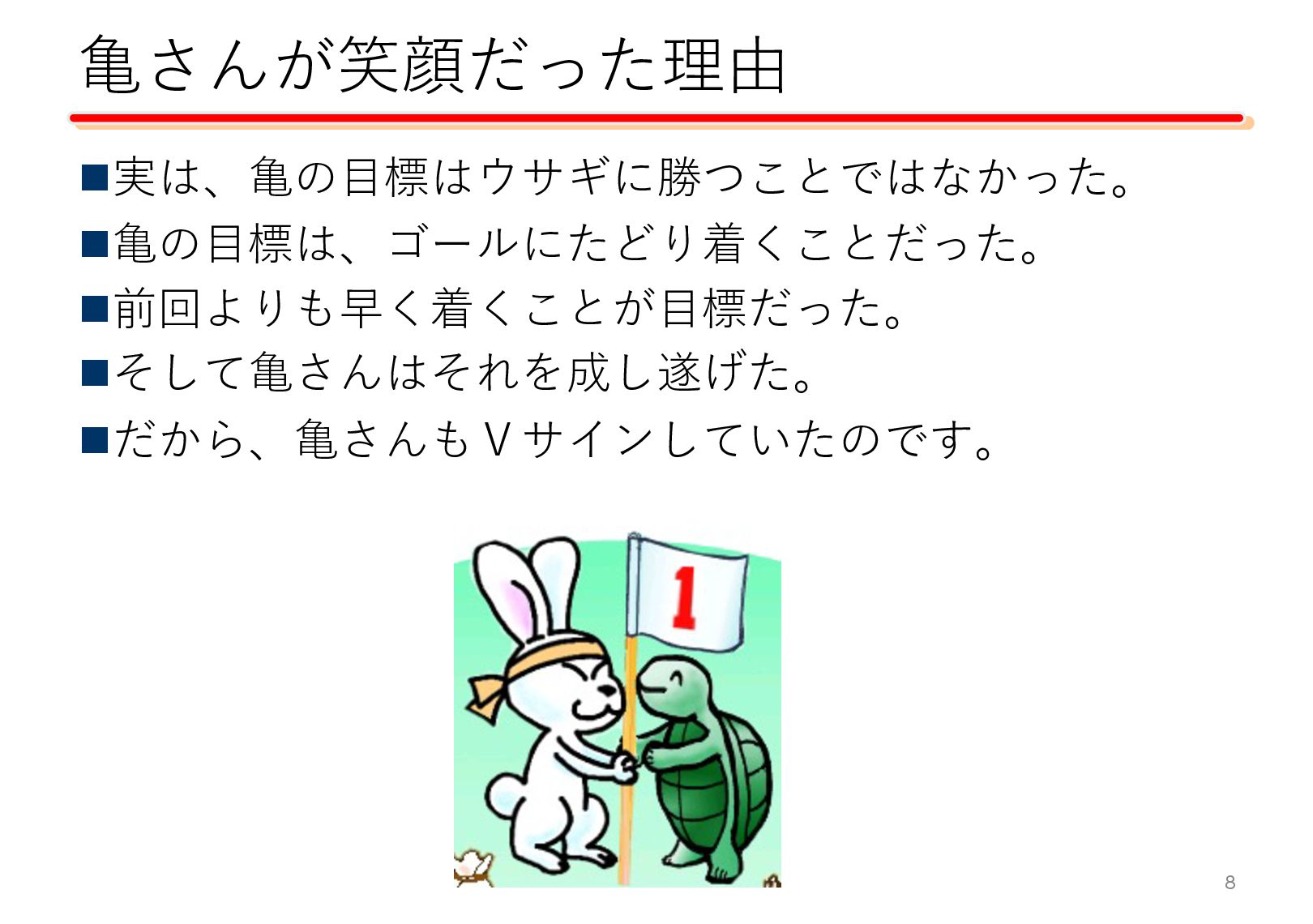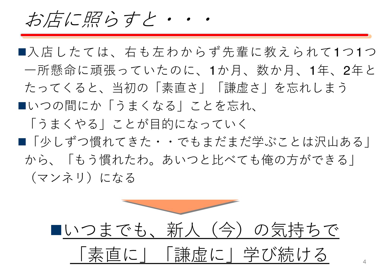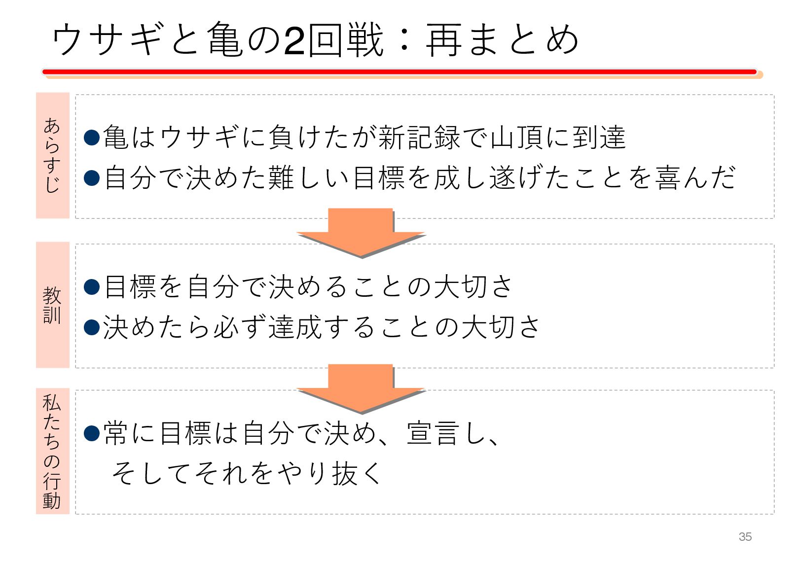 の⼤切さ l 決めたら必ず達成するこ との⼤切さ l 相⼿の「おかげ」に感謝 することの⼤切さ l ⻑所を認め合い、⾜し合 うことの⼤切さ l 仲間で⽬標を共有するこ との⼤切さ l いつまでも、新⼈(今)の気持ちで 「素直に」「謙虚に」学び続ける l 常に⽬標は⾃分で決め、宣⾔し、そして それをやり抜く l 毎⽇ちょっとしたことでもお互い 「ありがとう」を⾔う l スタッフ同⼠がお互い⻑所を認め合い、 ⼒を⾜し合う。 l 「お客様に喜んでもらう」という共通の ⽬標を毎⽇意識する(3⽅良しの実践) 37 あらすじ l ⾜が速いが、サボって寝て しまったウサギが負けた l ⾜は遅いが、登り続けた⻲が勝った l ⻲はウサギより遅かったが、 ⾃⼰新記録で⼭頂にたどり着いた l ⻲は、⾃分で決めた難しい⽬標を 成し遂げたことを喜んだ l 池は⻲がウサギを背負い、⼭道は ウサギが⻲を背負って共にゴールした l ⻲とウサギは共に喜んだ。