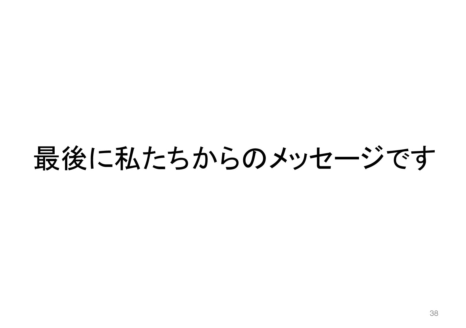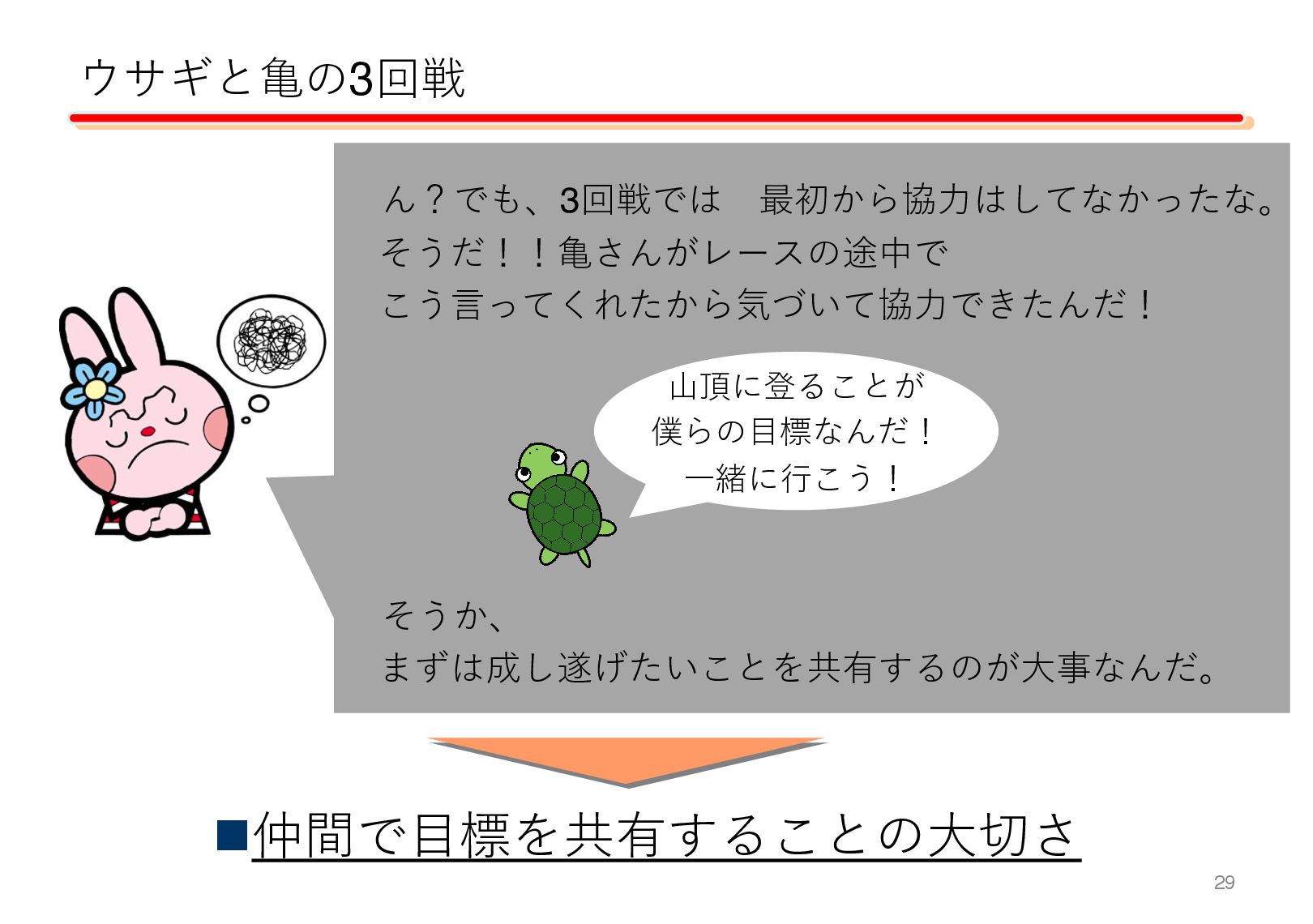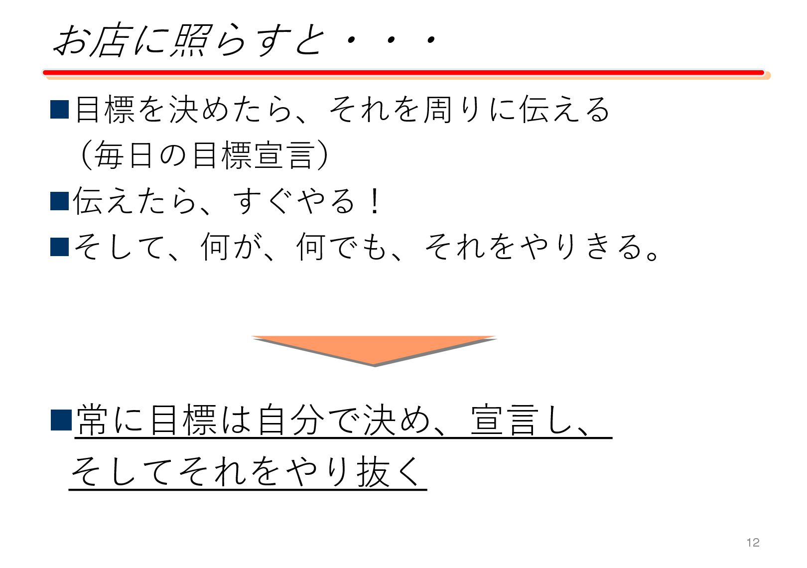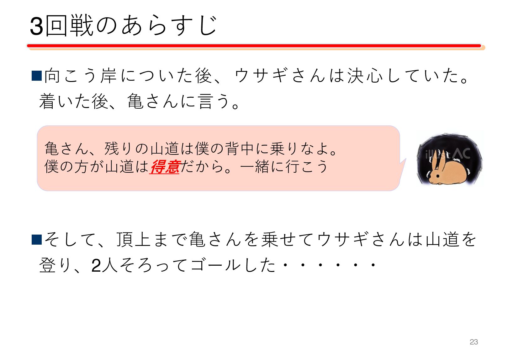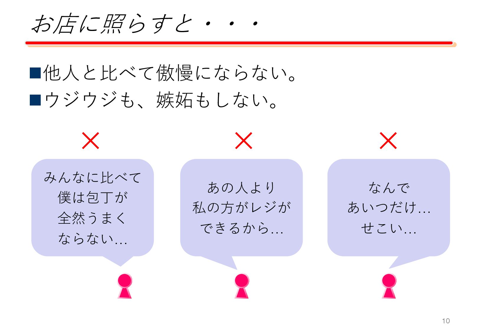の⼤切さ l 決めたら必ず達成するこ との⼤切さ l 相⼿の「おかげ」に感謝 することの⼤切さ l ⻑所を認め合い、⾜し合 うことの⼤切さ l 仲間で⽬標を共有するこ との⼤切さ l いつまでも、新⼈(今)の気持ちで 「素直に」「謙虚に」学び続ける l 常に⽬標は⾃分で決め、宣⾔し、そして それをやり抜く l 毎⽇ちょっとしたことでもお互い 「ありがとう」を⾔う l スタッフ同⼠がお互い⻑所を認め合い、 ⼒を⾜し合う。 l 「お客様に喜んでもらう」という共通の ⽬標を毎⽇意識する(3⽅良しの実践) 37 あらすじ l ⾜が速いが、サボって寝て しまったウサギが負けた l ⾜は遅いが、登り続けた⻲が勝った l ⻲はウサギより遅かったが、 ⾃⼰新記録で⼭頂にたどり着いた l ⻲は、⾃分で決めた難しい⽬標を 成し遂げたことを喜んだ l 池は⻲がウサギを背負い、⼭道は ウサギが⻲を背負って共にゴールした l ⻲とウサギは共に喜んだ。