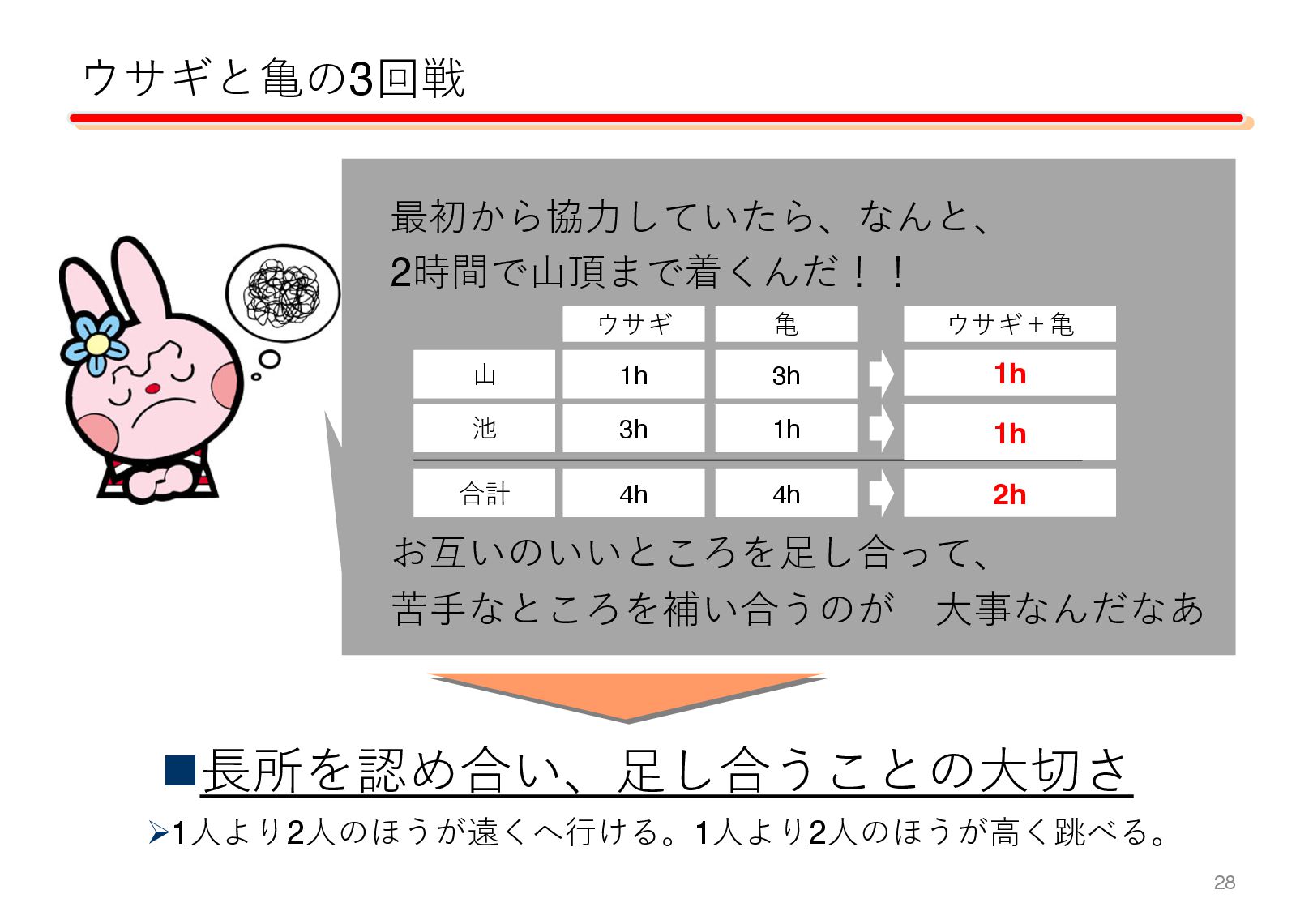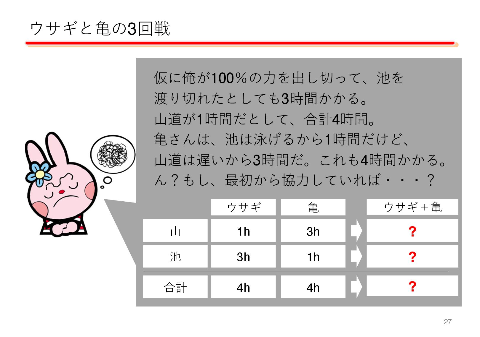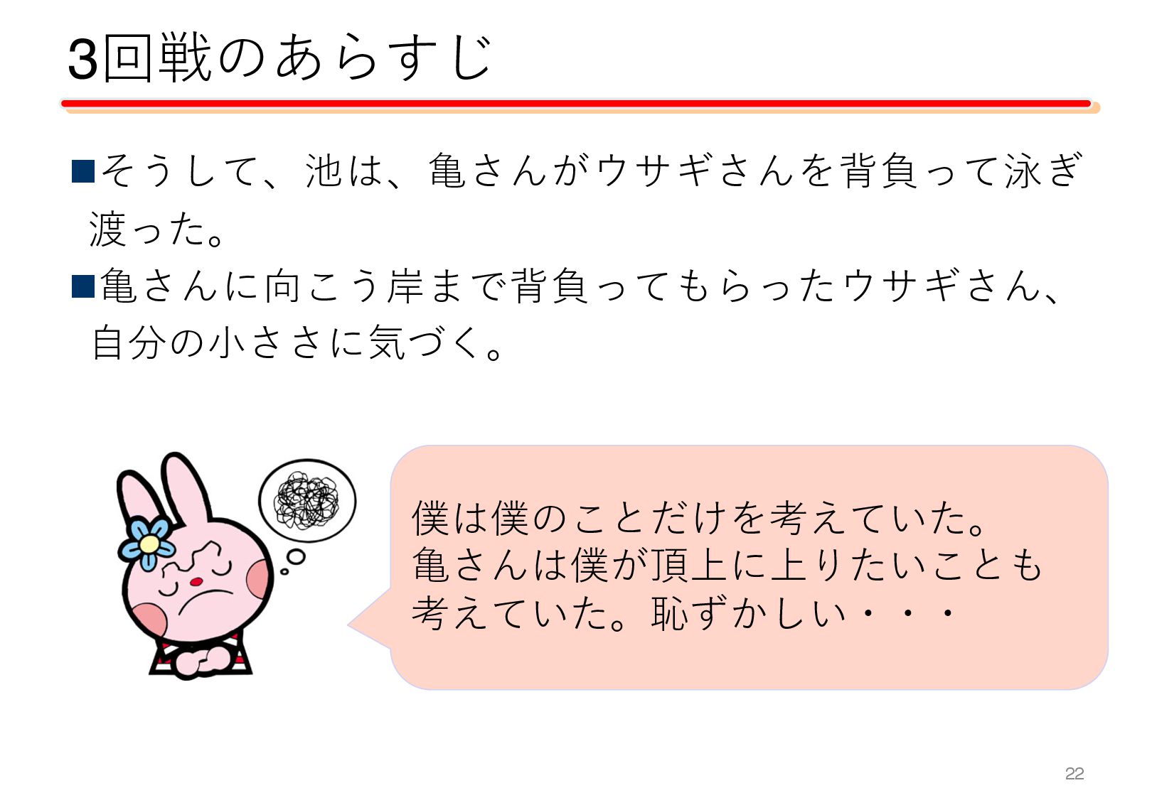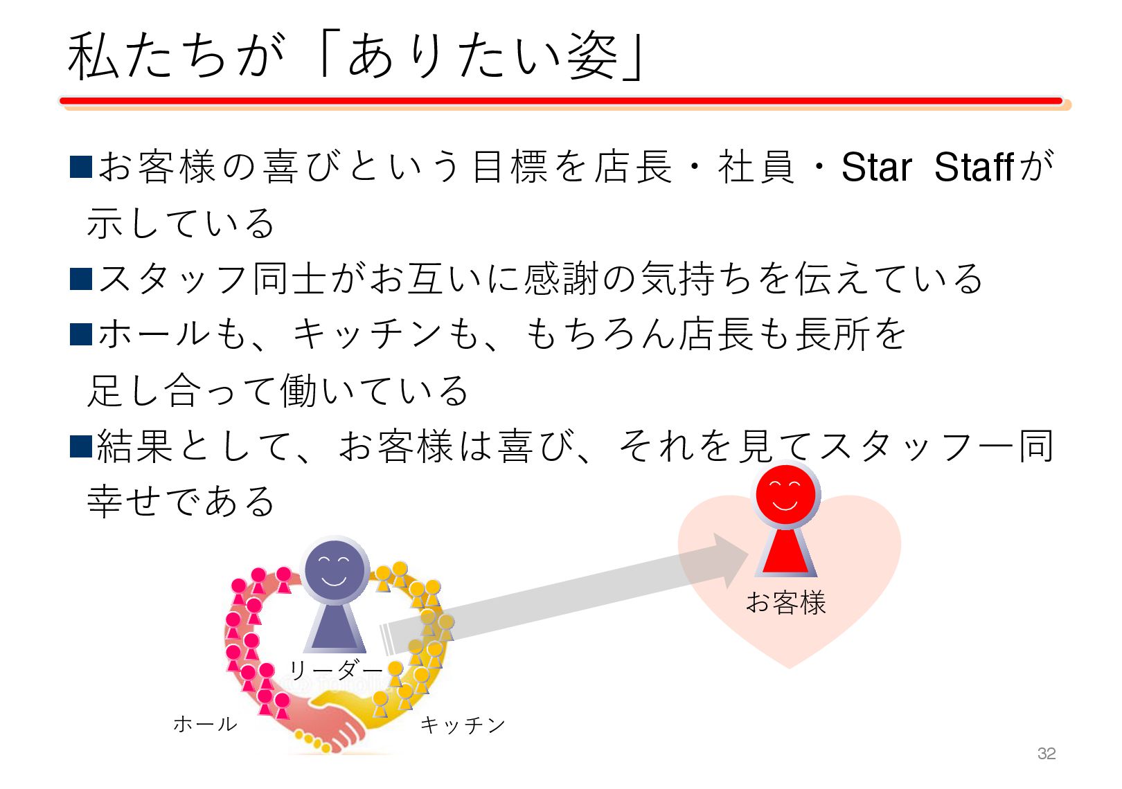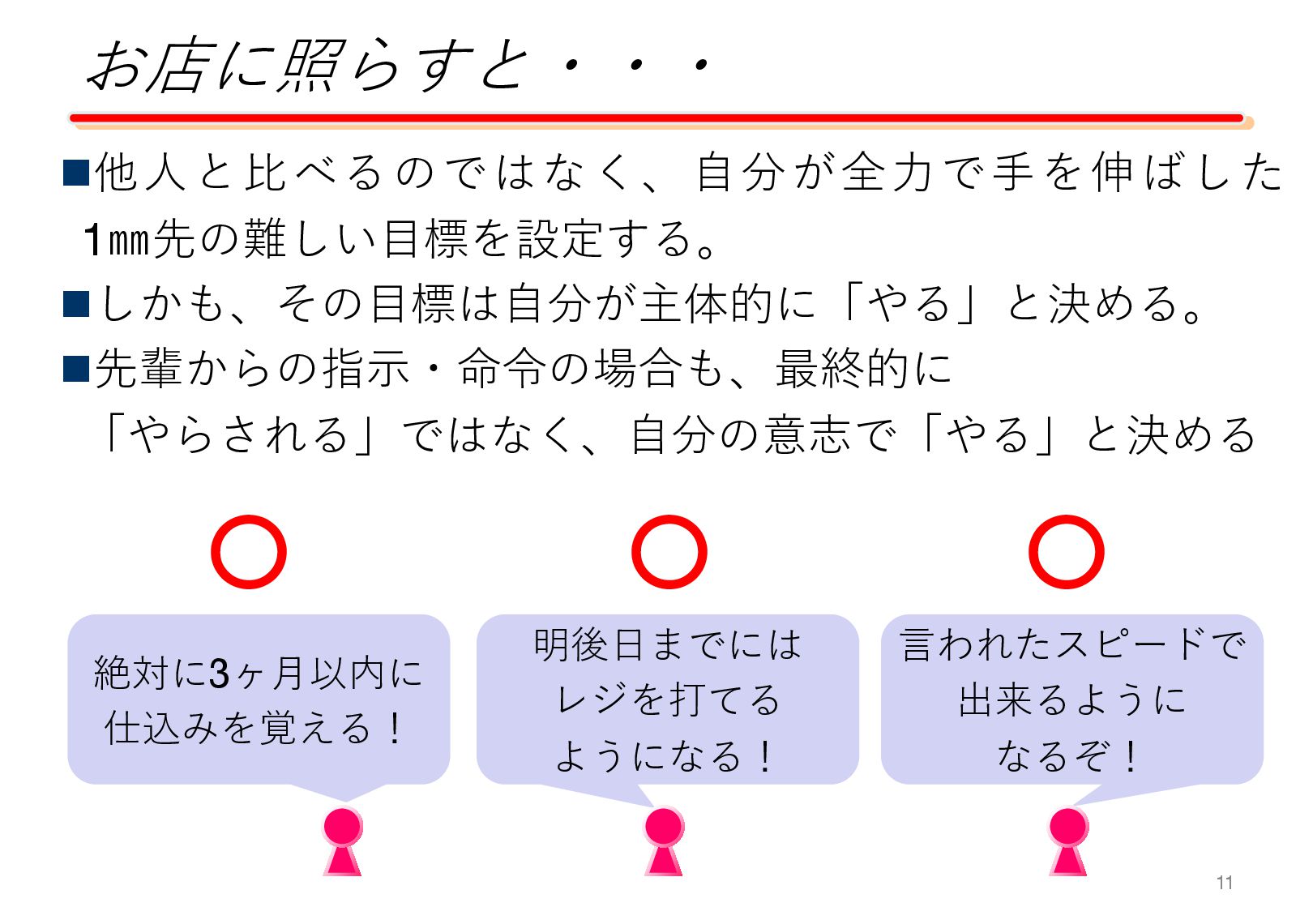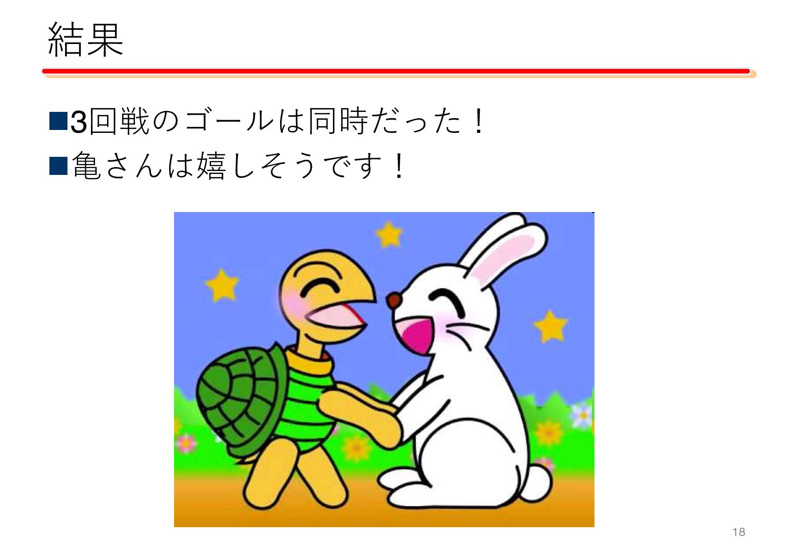 の⼤切さ l 決めたら必ず達成するこ との⼤切さ l 相⼿の「おかげ」に感謝 することの⼤切さ l ⻑所を認め合い、⾜し合 うことの⼤切さ l 仲間で⽬標を共有するこ との⼤切さ l いつまでも、新⼈(今)の気持ちで 「素直に」「謙虚に」学び続ける l 常に⽬標は⾃分で決め、宣⾔し、そして それをやり抜く l 毎⽇ちょっとしたことでもお互い 「ありがとう」を⾔う l スタッフ同⼠がお互い⻑所を認め合い、 ⼒を⾜し合う。 l 「お客様に喜んでもらう」という共通の ⽬標を毎⽇意識する(3⽅良しの実践) 37 あらすじ l ⾜が速いが、サボって寝て しまったウサギが負けた l ⾜は遅いが、登り続けた⻲が勝った l ⻲はウサギより遅かったが、 ⾃⼰新記録で⼭頂にたどり着いた l ⻲は、⾃分で決めた難しい⽬標を 成し遂げたことを喜んだ l 池は⻲がウサギを背負い、⼭道は ウサギが⻲を背負って共にゴールした l ⻲とウサギは共に喜んだ。