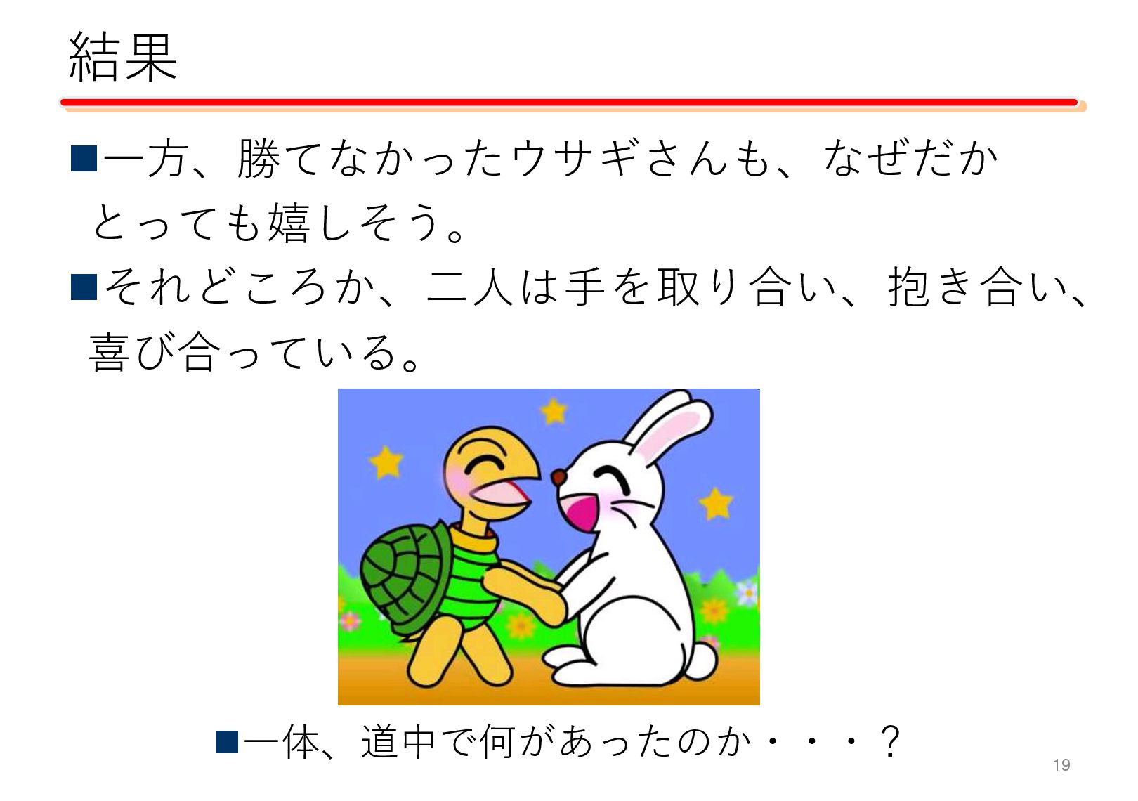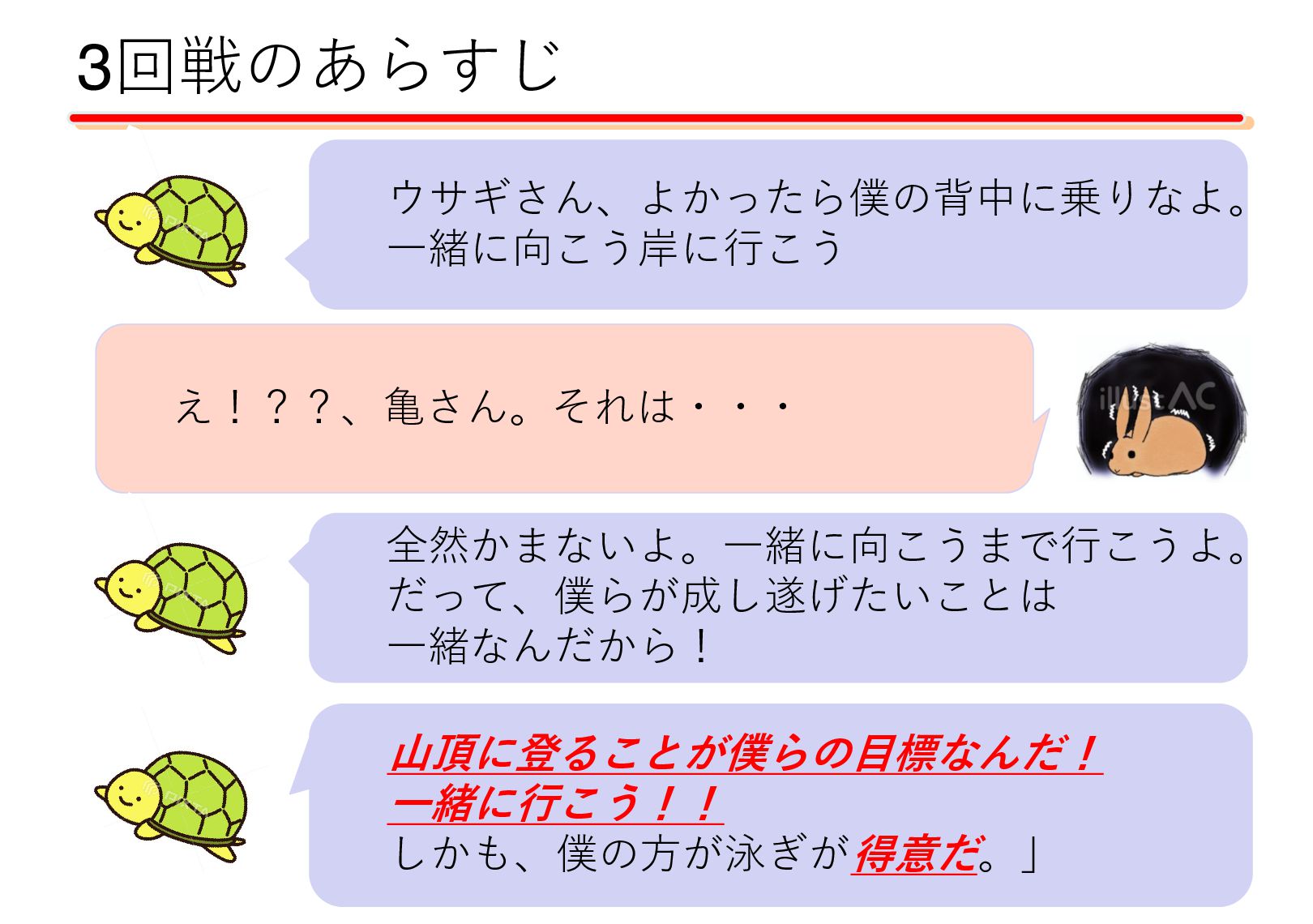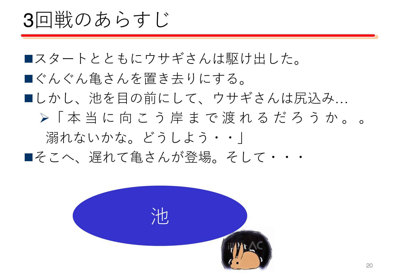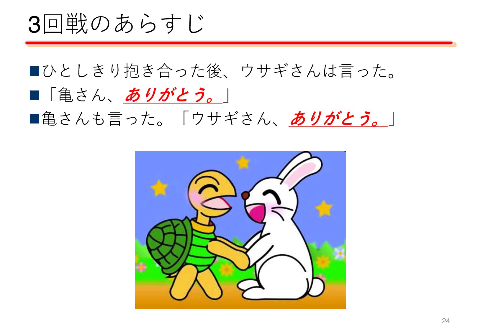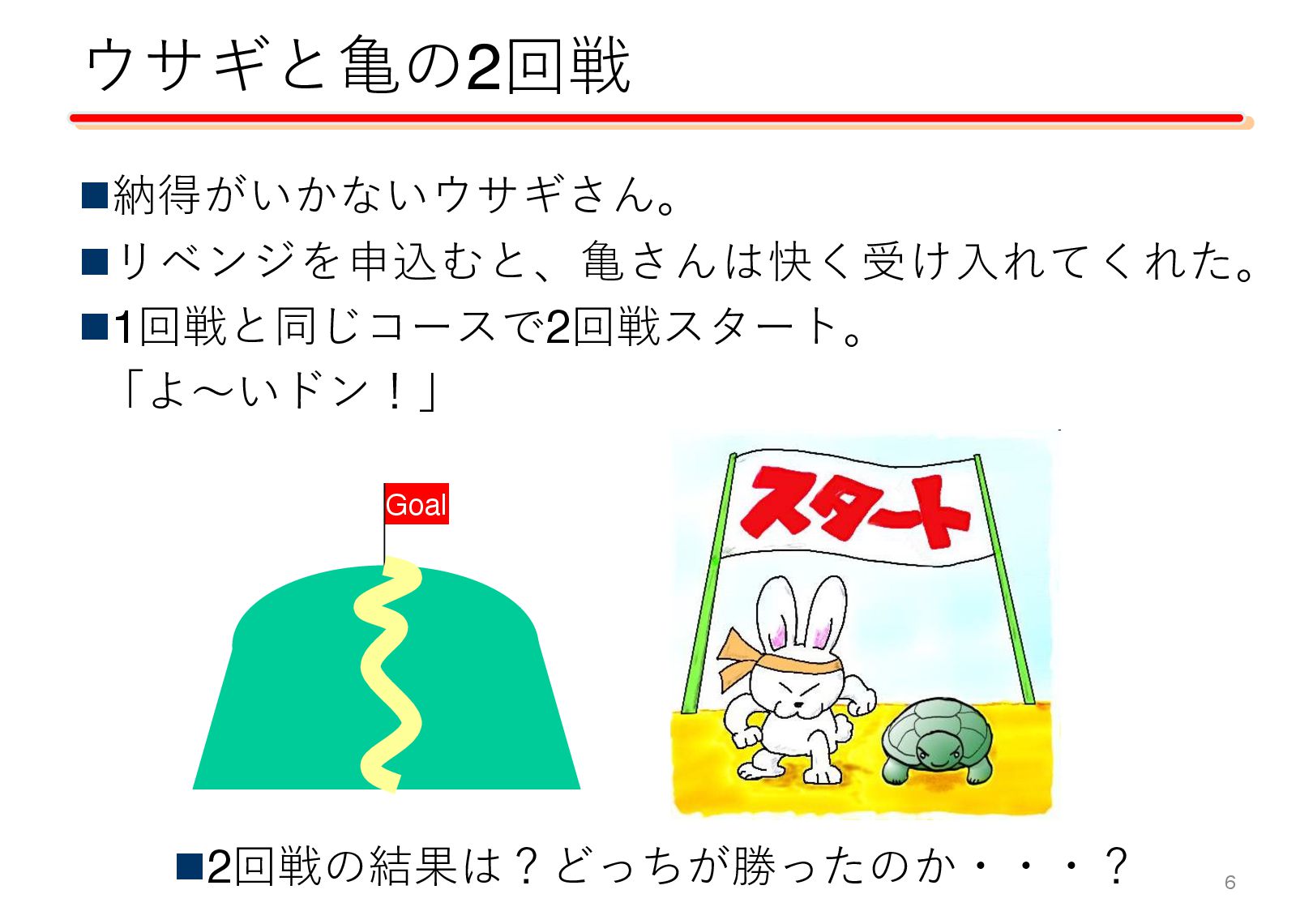 の⼤切さ l 決めたら必ず達成するこ との⼤切さ l 相⼿の「おかげ」に感謝 することの⼤切さ l ⻑所を認め合い、⾜し合 うことの⼤切さ l 仲間で⽬標を共有するこ との⼤切さ l いつまでも、新⼈(今)の気持ちで 「素直に」「謙虚に」学び続ける l 常に⽬標は⾃分で決め、宣⾔し、そして それをやり抜く l 毎⽇ちょっとしたことでもお互い 「ありがとう」を⾔う l スタッフ同⼠がお互い⻑所を認め合い、 ⼒を⾜し合う。 l 「お客様に喜んでもらう」という共通の ⽬標を毎⽇意識する(3⽅良しの実践) 37 あらすじ l ⾜が速いが、サボって寝て しまったウサギが負けた l ⾜は遅いが、登り続けた⻲が勝った l ⻲はウサギより遅かったが、 ⾃⼰新記録で⼭頂にたどり着いた l ⻲は、⾃分で決めた難しい⽬標を 成し遂げたことを喜んだ l 池は⻲がウサギを背負い、⼭道は ウサギが⻲を背負って共にゴールした l ⻲とウサギは共に喜んだ。