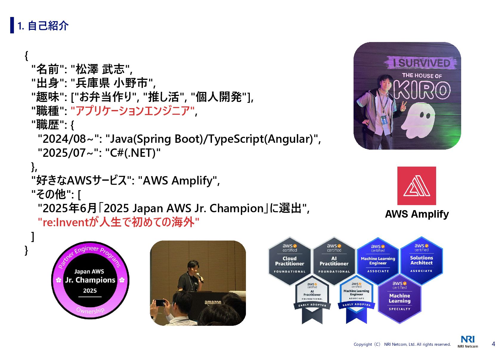 { "名前": "松澤 武志", "出身": "兵庫県 小野市", "趣味": ["お弁当作り", "推し活", "個人開発"], "職種": "アプリケーションエンジニア", "職歴": { "2024/08~": "Java(Spring Boot)/TypeScript(Angular)", "2025/07~": "C#(.NET)" }, "好きなAWSサービス": "AWS Amplify", "その他": [ "2025年6月「2025 Japan AWS Jr. Champion」に選出", "re:Inventが人生で初めての海外" ] } AWS Amplify