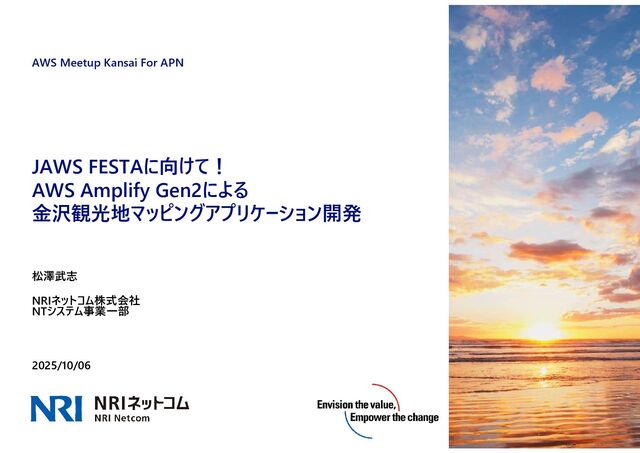 AWS Meetup Kansai for APNでの登壇にて使用したスライドとなります。 AWS Amplify Gen2を利用し、個人で金沢の観光地マッピングアプリケーション(かなまっぷ)の開発を行いました。開発した所感やAmplify Geo、Amplify Dataについてまとめました。 「かなまっぷ」使ってみたの章では登壇時動画を流す予定でしたが、SpeakerDeck上では流せませんでした。ご容赦ください。