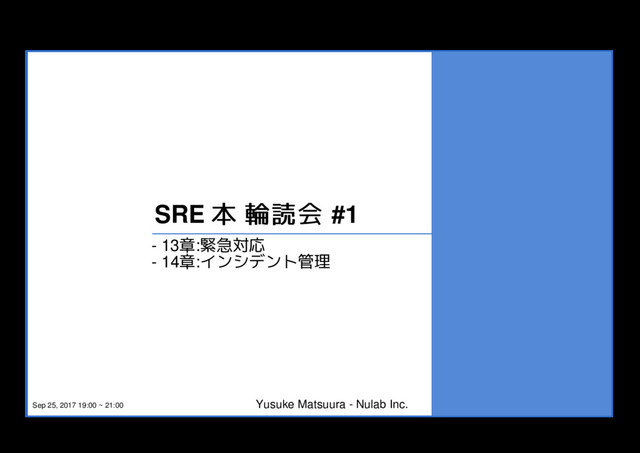: 通知チャネル 通知チャネル Backlog の緊急対応 : 通知チャネル Topic for Nagios Topic for Twitter Topic for Mackerel Meet for Emergency Topic for Emergency 各トピックの状況を みて緊急対応用のト ピックにポストする Nulabers - SRE/DEV - Support 緊急用のトピックに投稿された らすぐに反応し調査を開始する その際に Meet に接続し会話で きる状態にする Nulaber Customers サポートチームが障 害状況を顧客にアッ プデートする